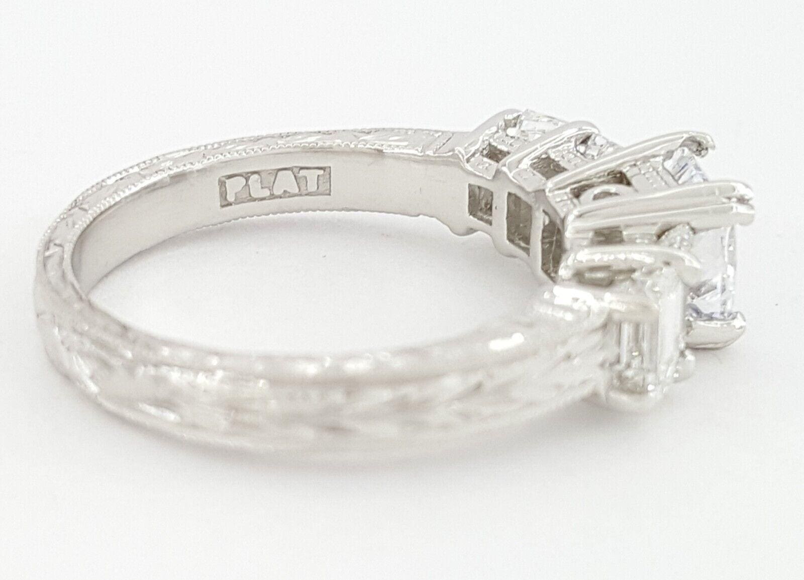 The mounting has 4 Emerald cut side diamonds weighing approximately 1 ct, G+ in color, VS2+ in clarity. The ring has nice hand engravings. We can resize this ring to most finger sizes.