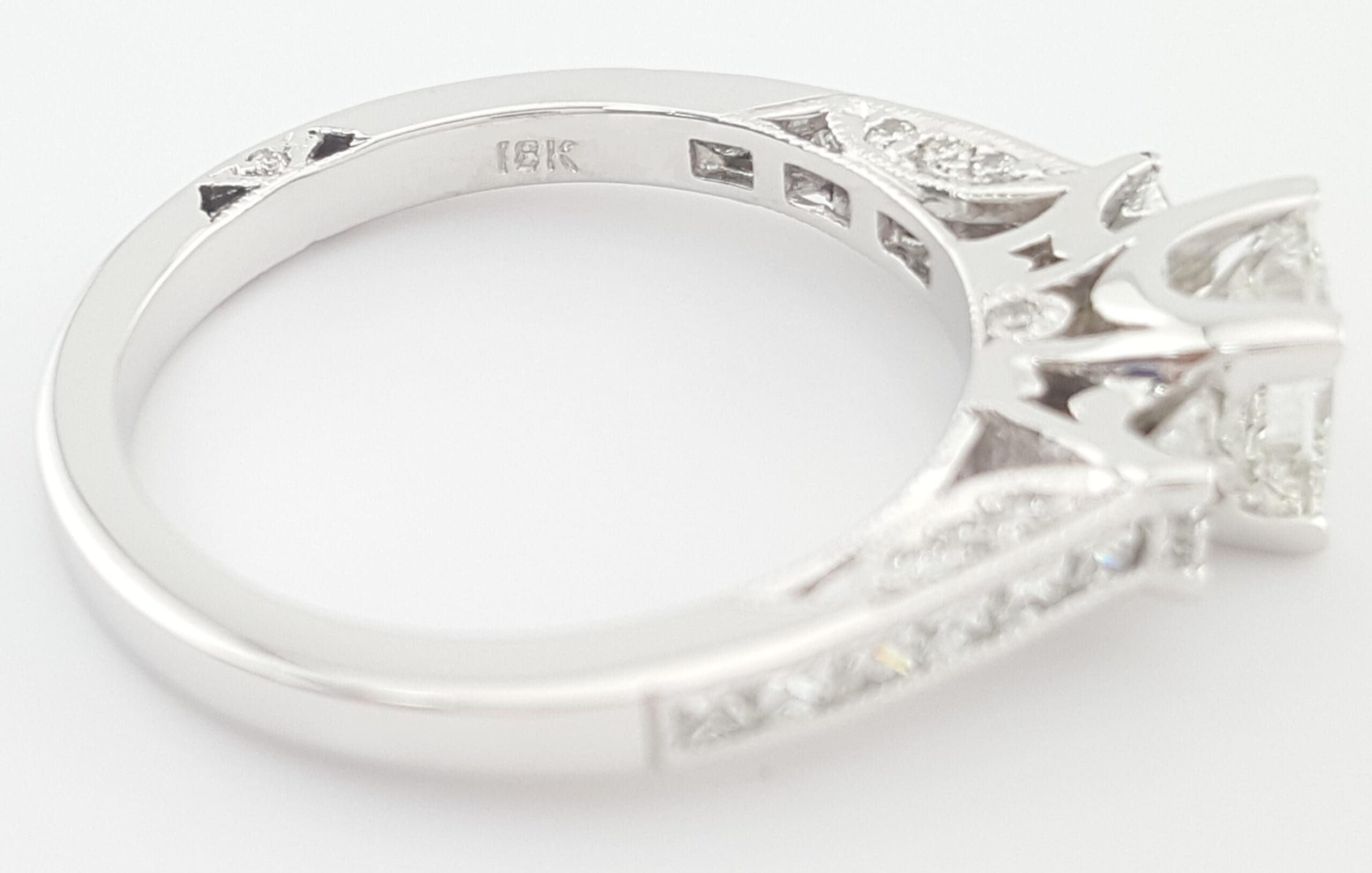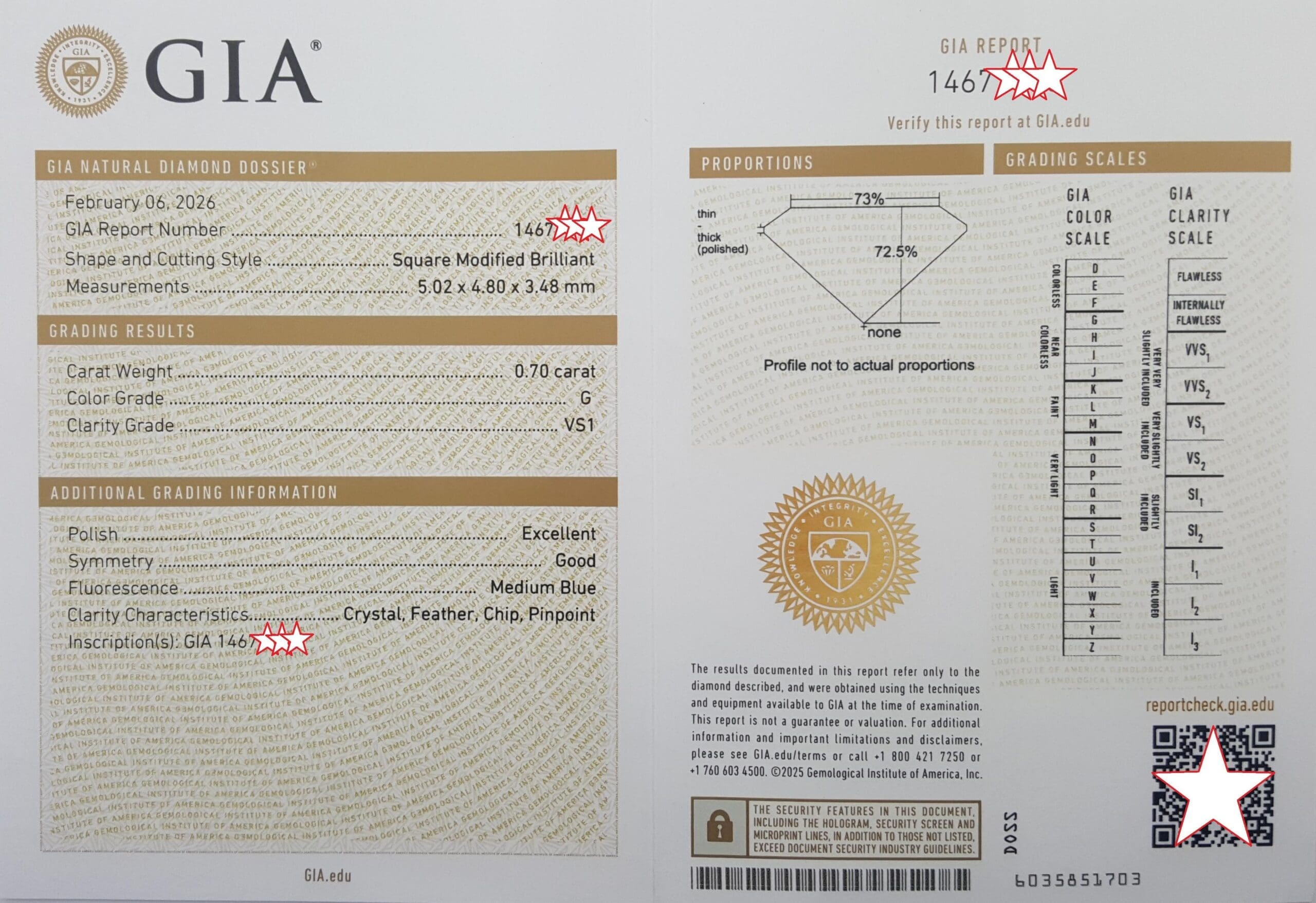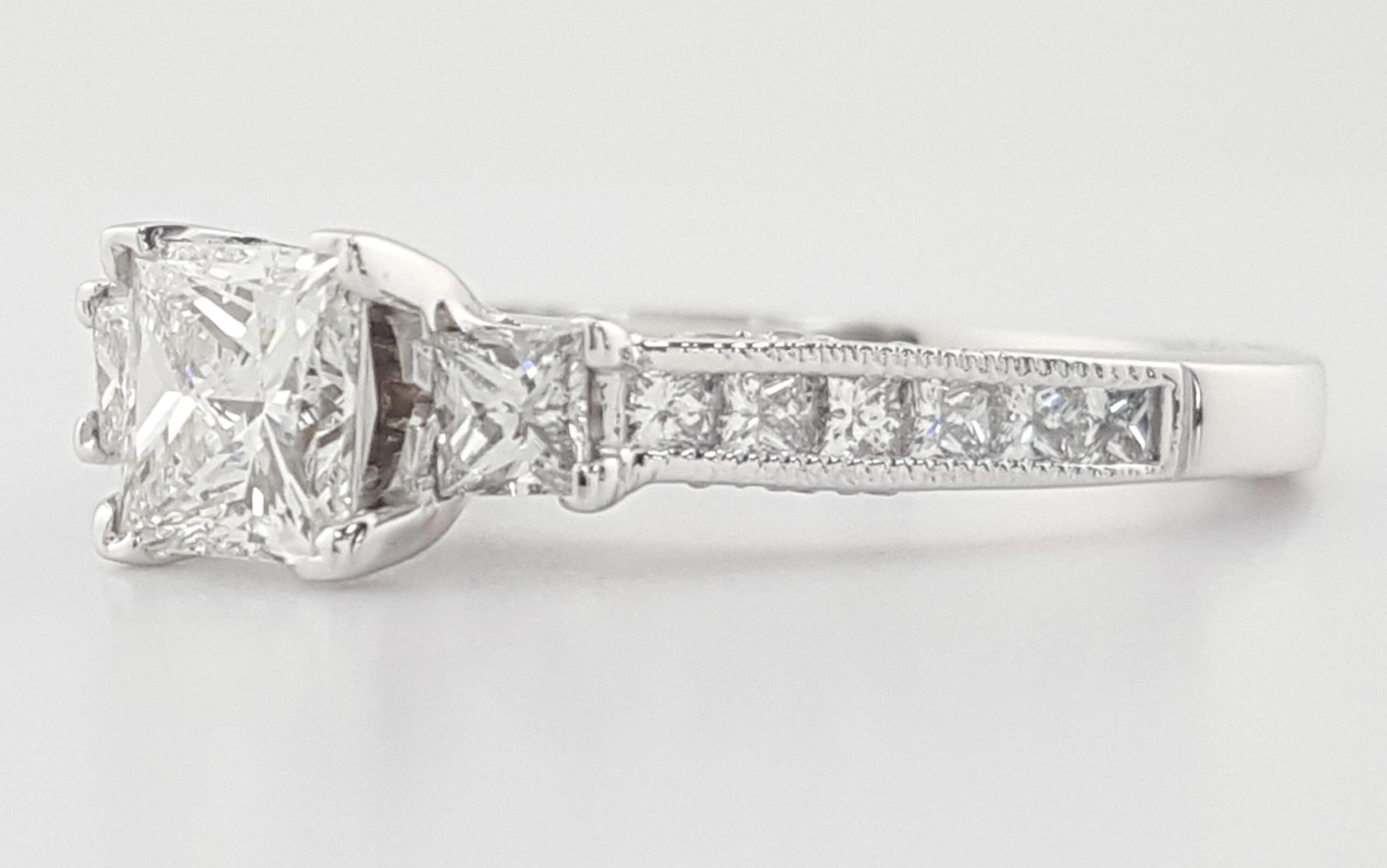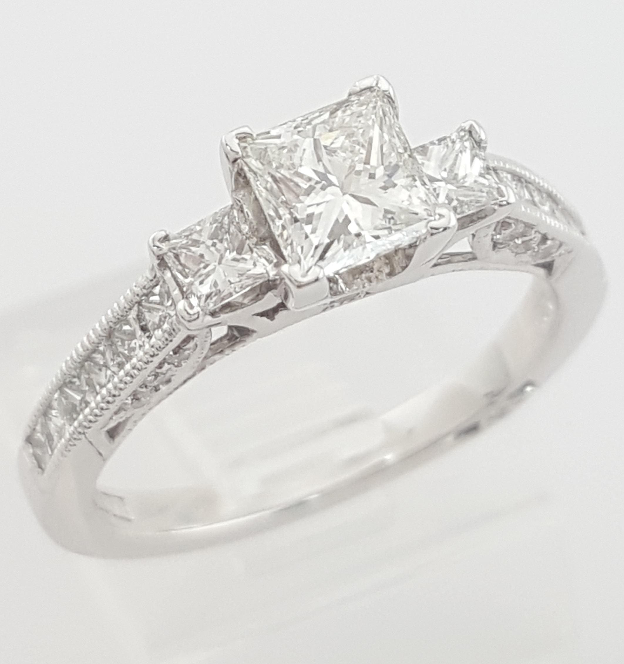 The ring weighs 4 grams, size 6.5, the center stone is a 0.7 ct Natural Princess Brilliant Cut diamond, G in color, VS1 in clarity. The center diamond has Excellent polish, Good symmetry, Medium Blue fluorescence, measuring 5.02 x 4.80 x 3.48 mm, Inscribed "GIA 1467****".