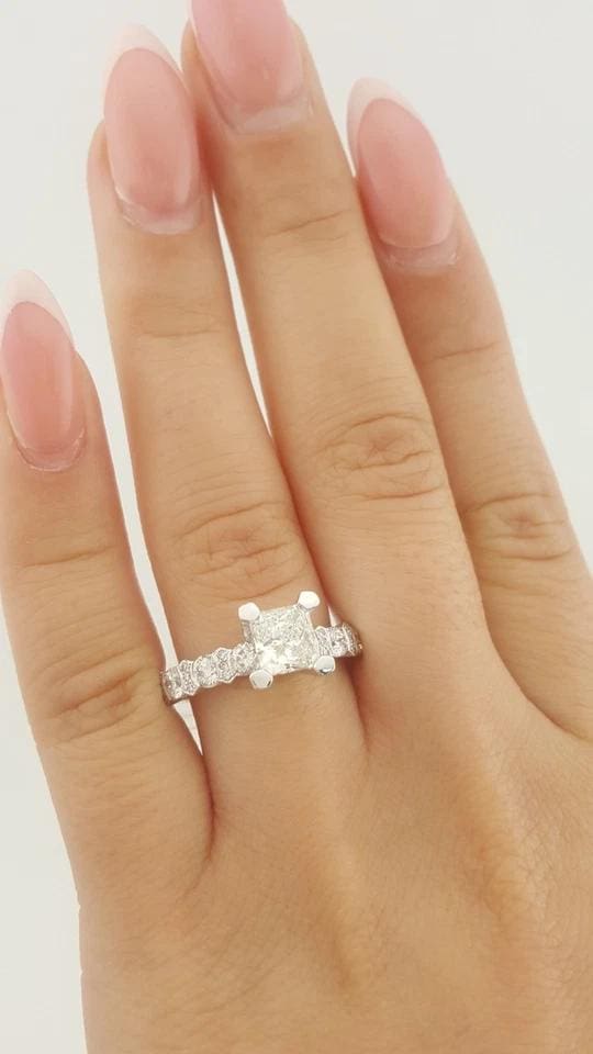 The ring weighs 5.8 grams, size 6.5, the center stone is a 1.07 ct Natural Princess Brilliant Cut diamond, L in color, SI2 in clarity, Good Polish, Fair Symmetry, Faint Fluorescence, with girdle inscription "GIA 223578****".
