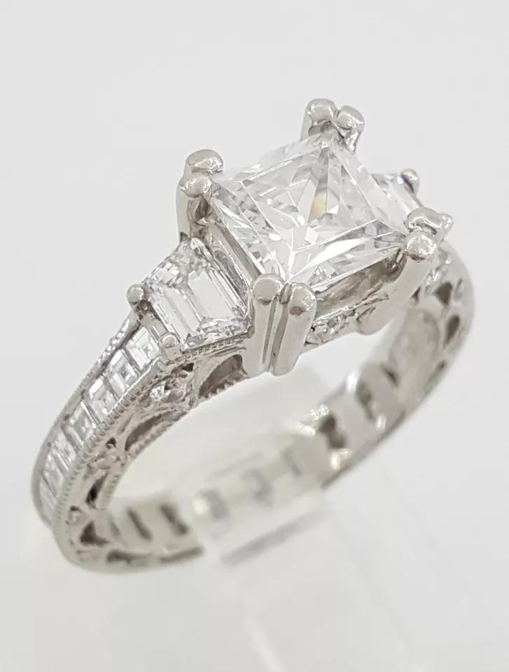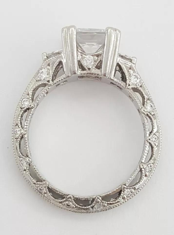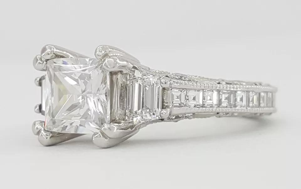 The ring mounting has 1.70 ct of Natural Round Brilliant, Trapezoid & Princess Brilliant cut diamonds, G+ in color, VS2+ in clarity.