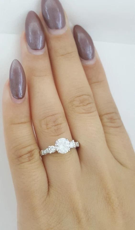 The ring mounting has 2 Natural Round & 2 Tapered Baguette cut side diamonds weighing ~0.25 ct, F-G in color, VVS-VS in clarity.