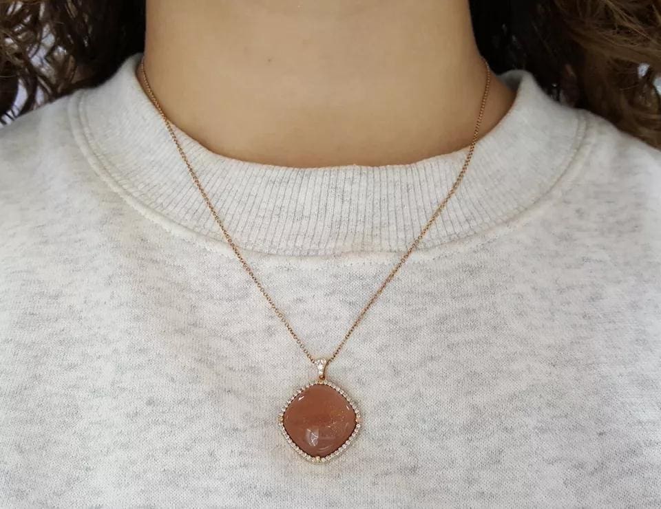 The pendant contains 1 Moon Rose(Peach Color) Cushion Cab Cut Moonstone weighing approximately 15 ct. The width of the pendant is 21.5 mm, 21.5 mm(28mm with bail) long, 6.7 mm thick.