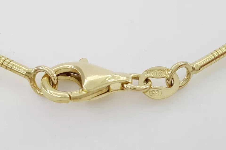 The necklace weighs 20.3 grams, 32.8 x 19.7 x 9.5mm, the round omega is 17" long, 1.4mm thick, solid 14K Yellow Gold.