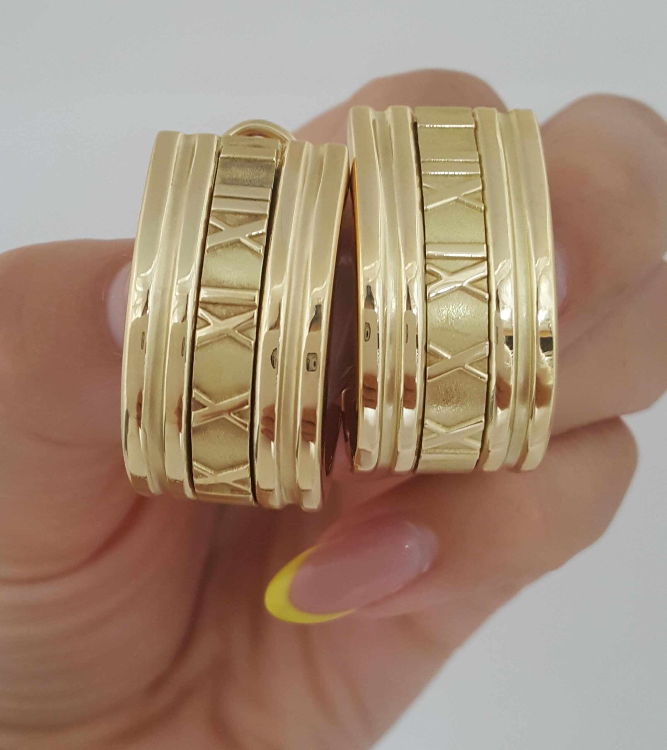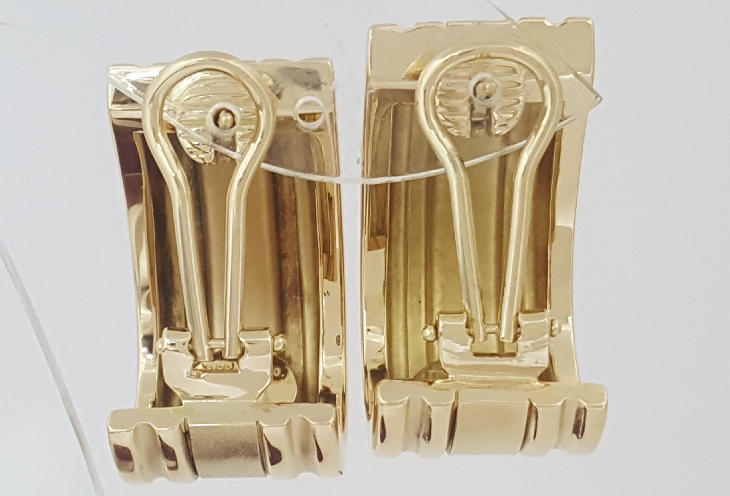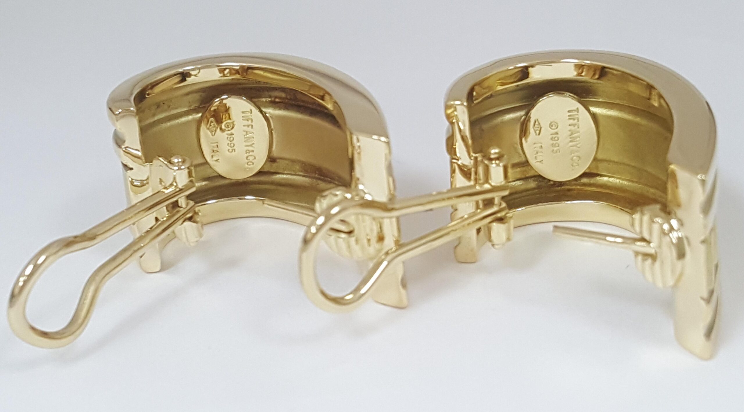 The earrings weigh 25.9 grams, ~31 x 16 x 3.5mm, solid 18k Yellow Gold, in excellent condition, are stamped "© 1995 Tiffany & Co. 750 ITALY". These can be worn as regular post earrings or as ear-clips. The posts are on the moveable hinge.