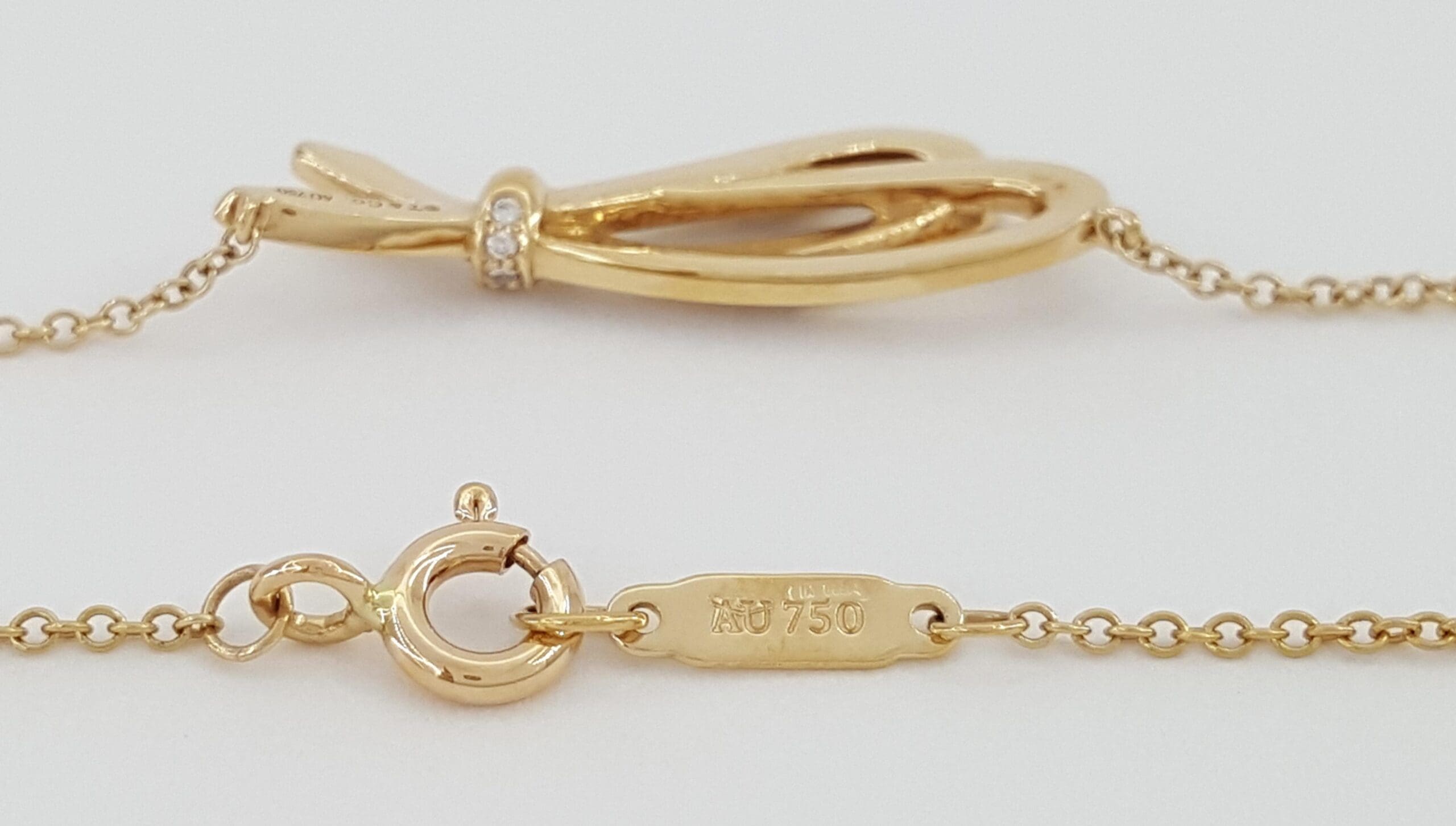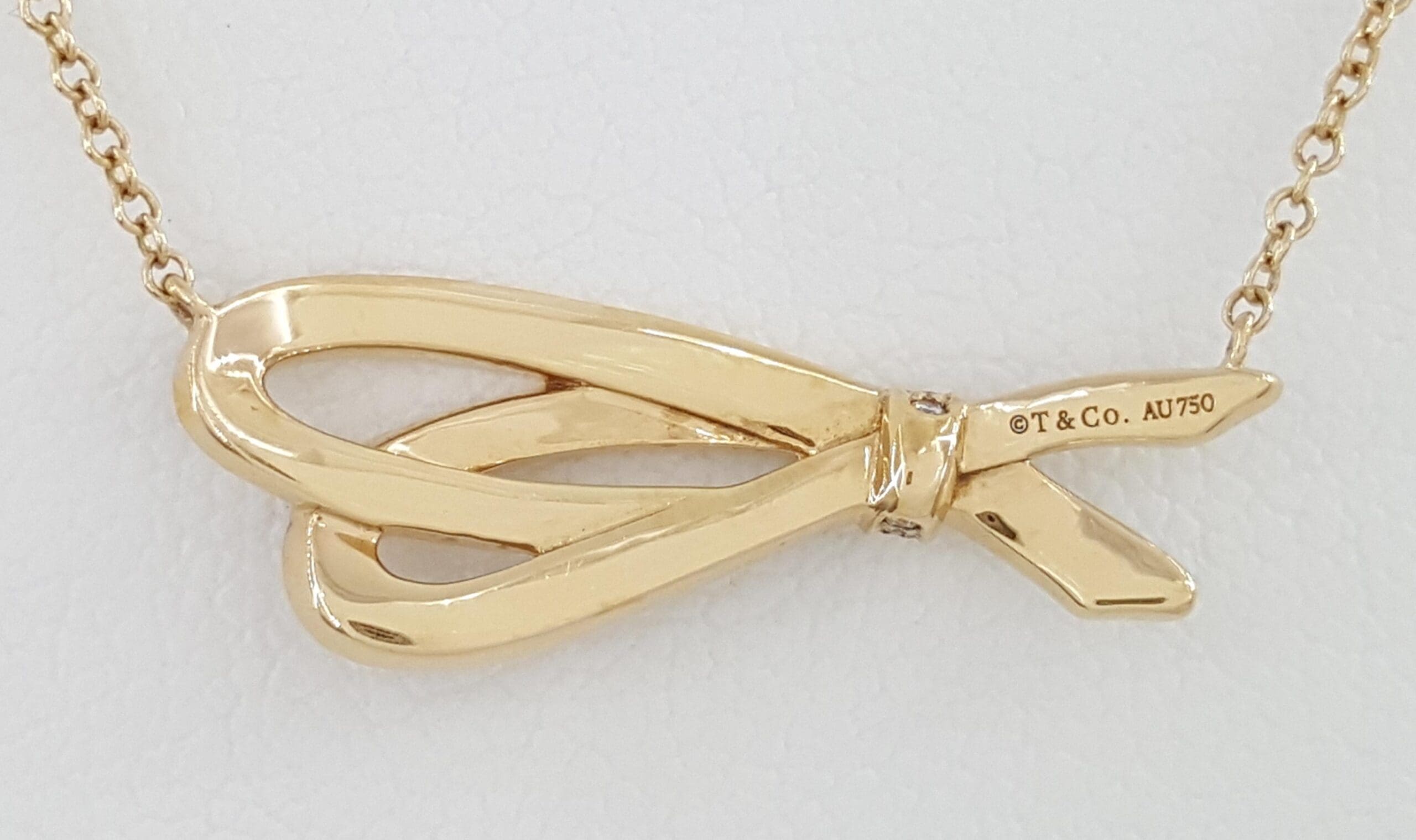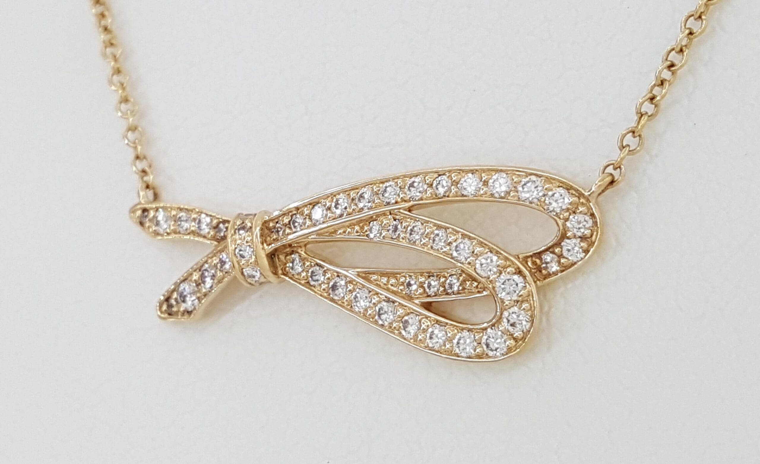 You are purchasing an Authentic Tiffany & Company Tiffany & Co Bow Ribbon 0.39 ct Round Brilliant Diamond Pendant Necklace in 18K Rose Gold