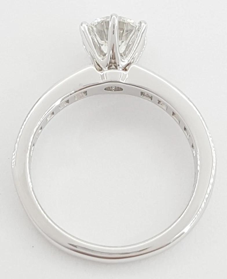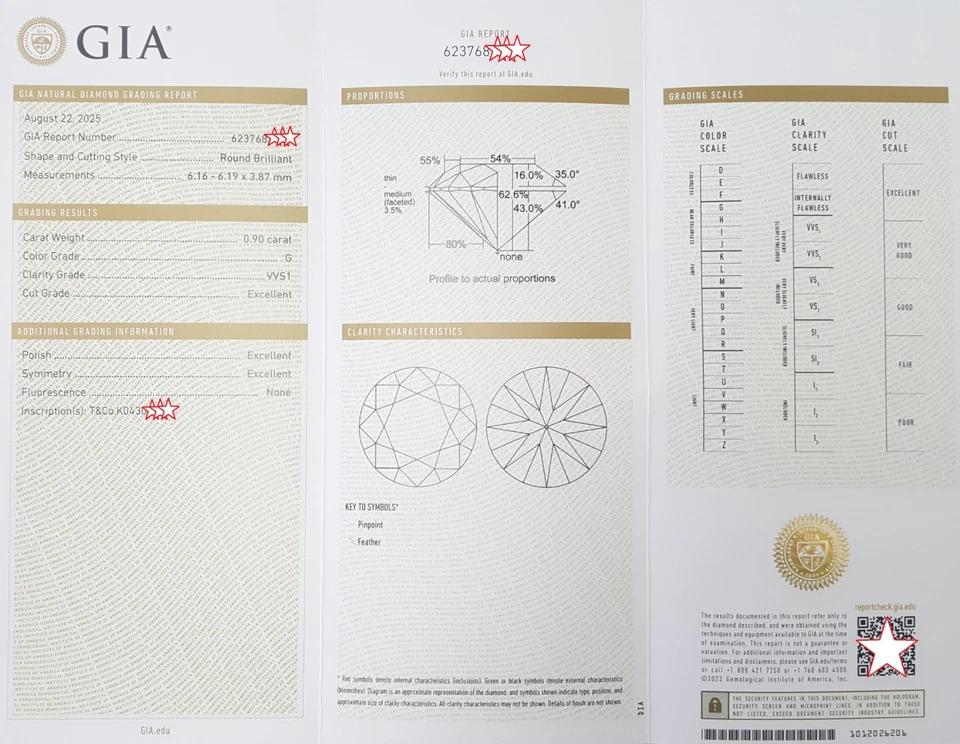 The ring weighs 5.2 grams, size 4.5, the center diamond is a Natural 0.90 ct Round Brilliant, G in color, VVS1 in Clarity, has Triple Excellent Cut & None Fluorescence. Has diamond Crown inscription "T&Co. K0430****".