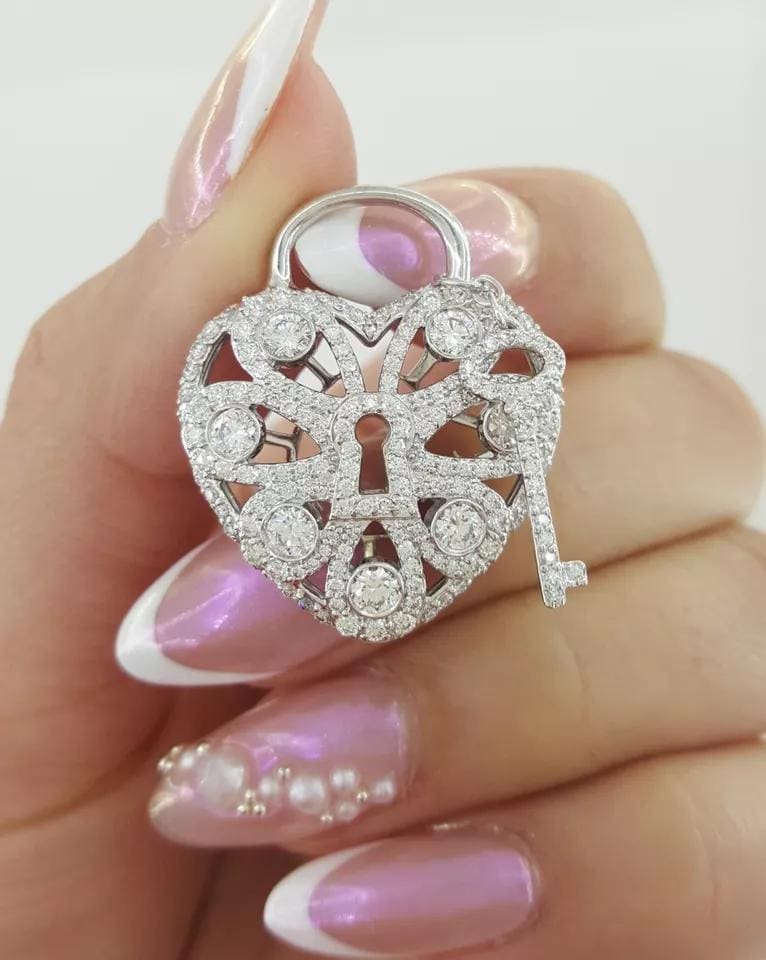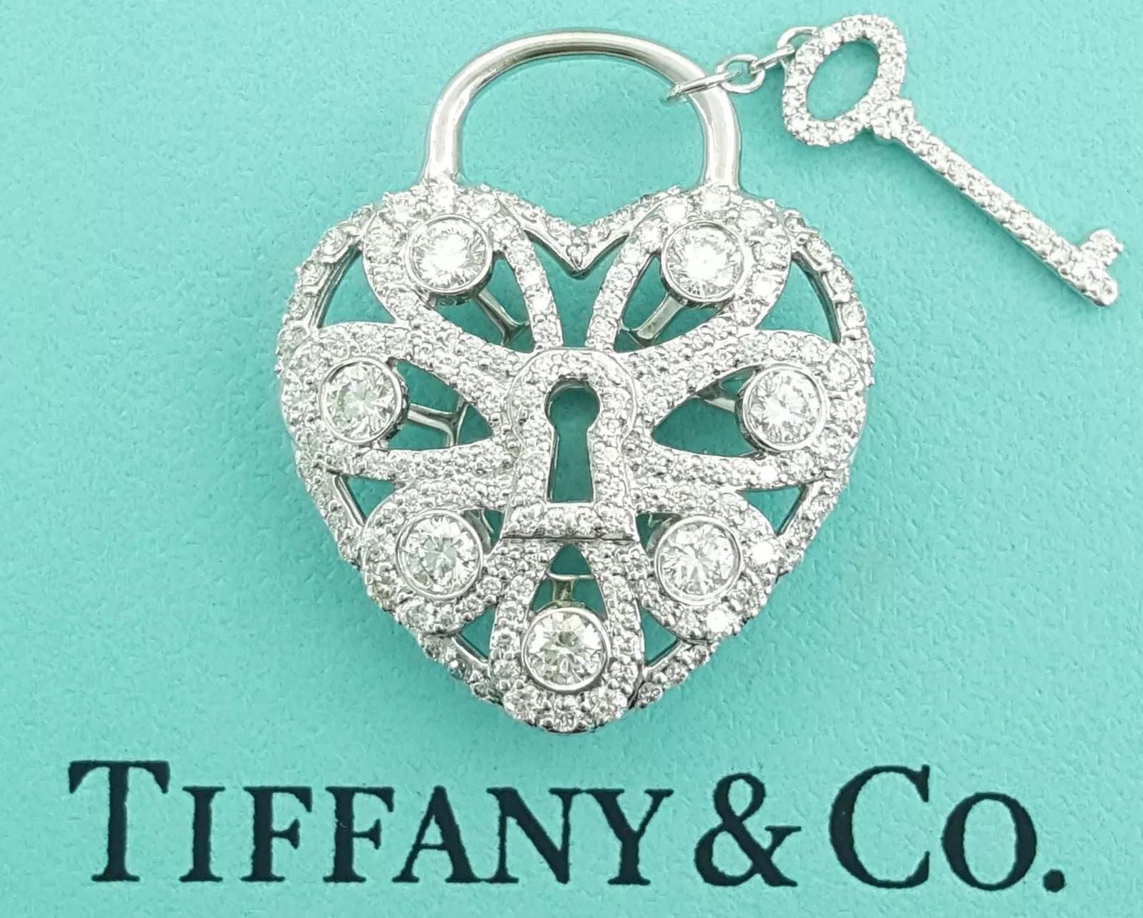 You are Buying an Authentic Tiffany & Co. 1.44 ct Round Cut Diamond Heart Lock & Key Pendant in 18K White Gold