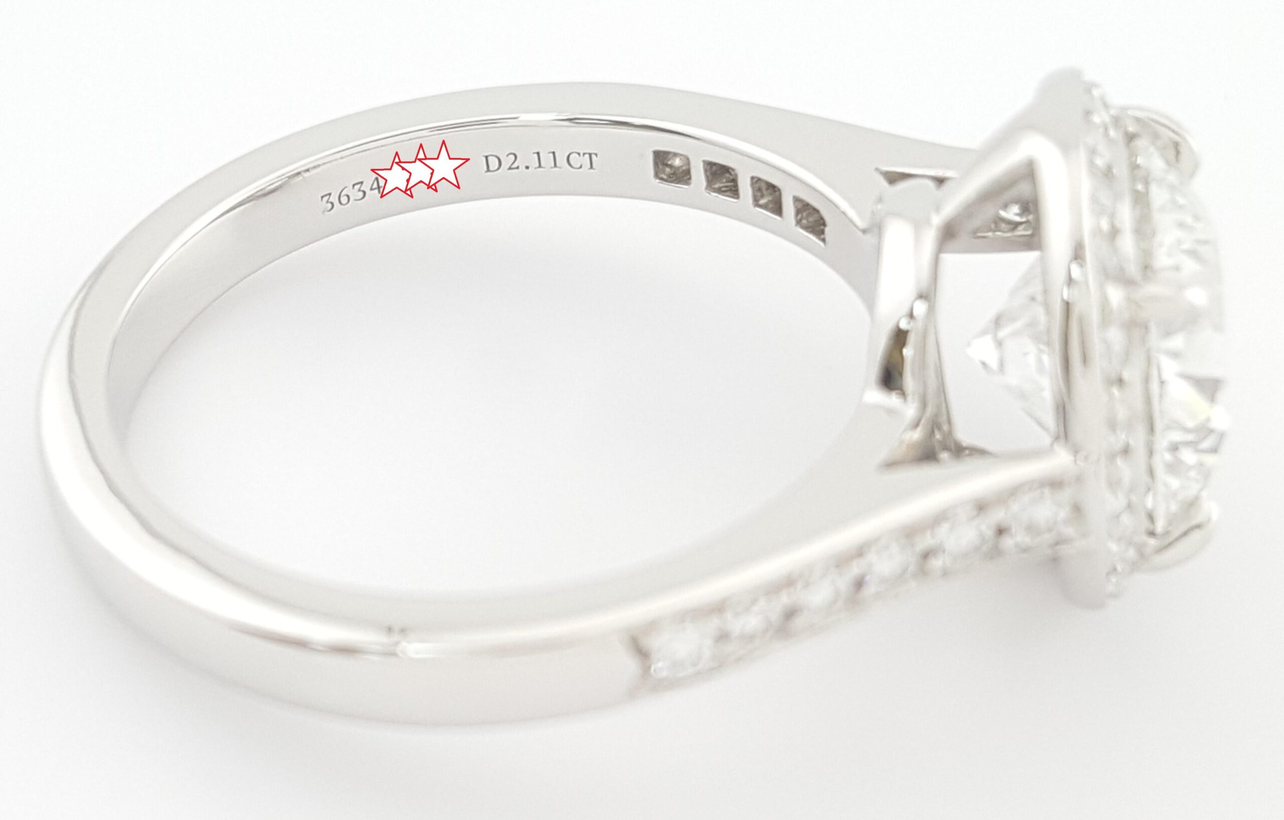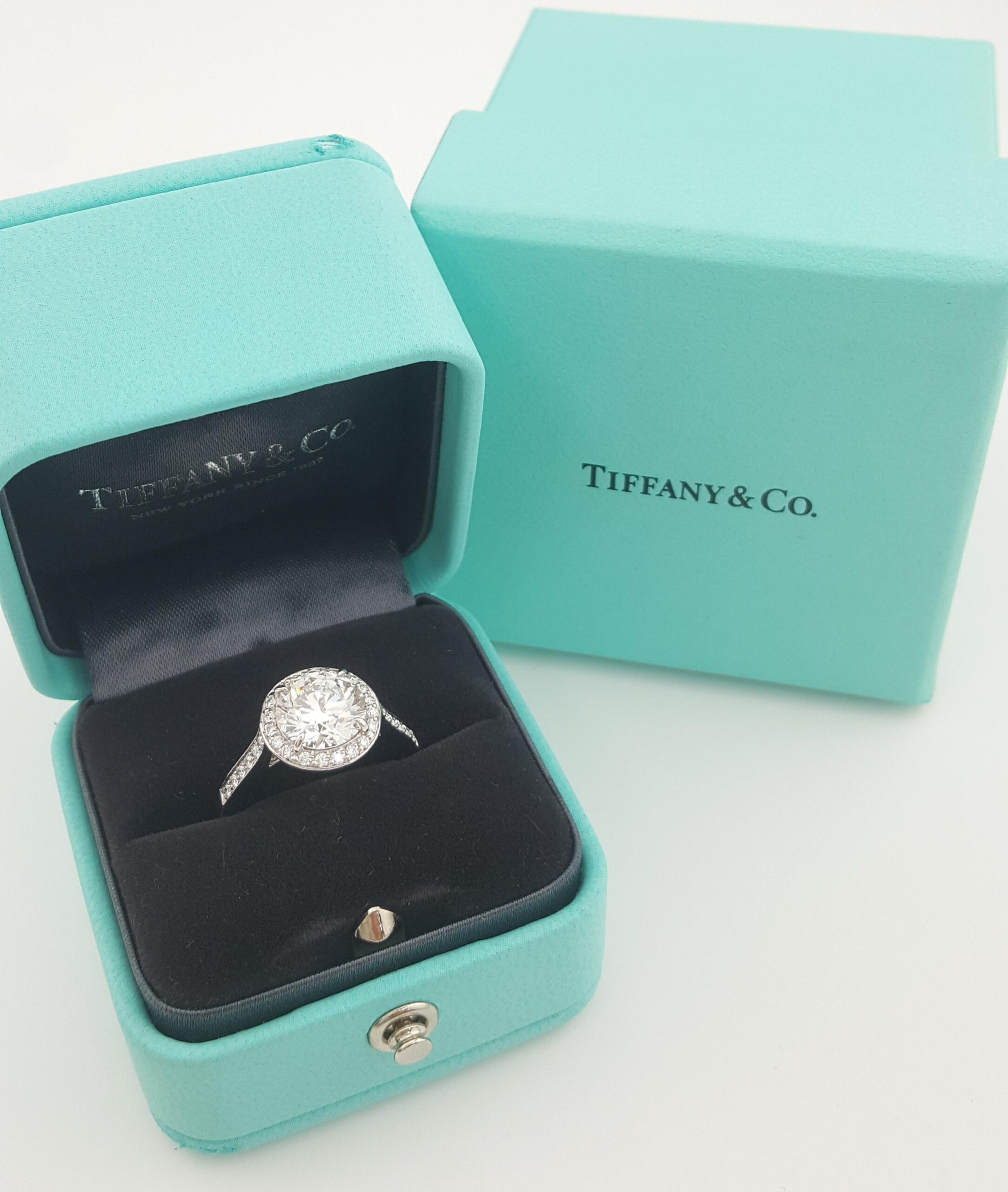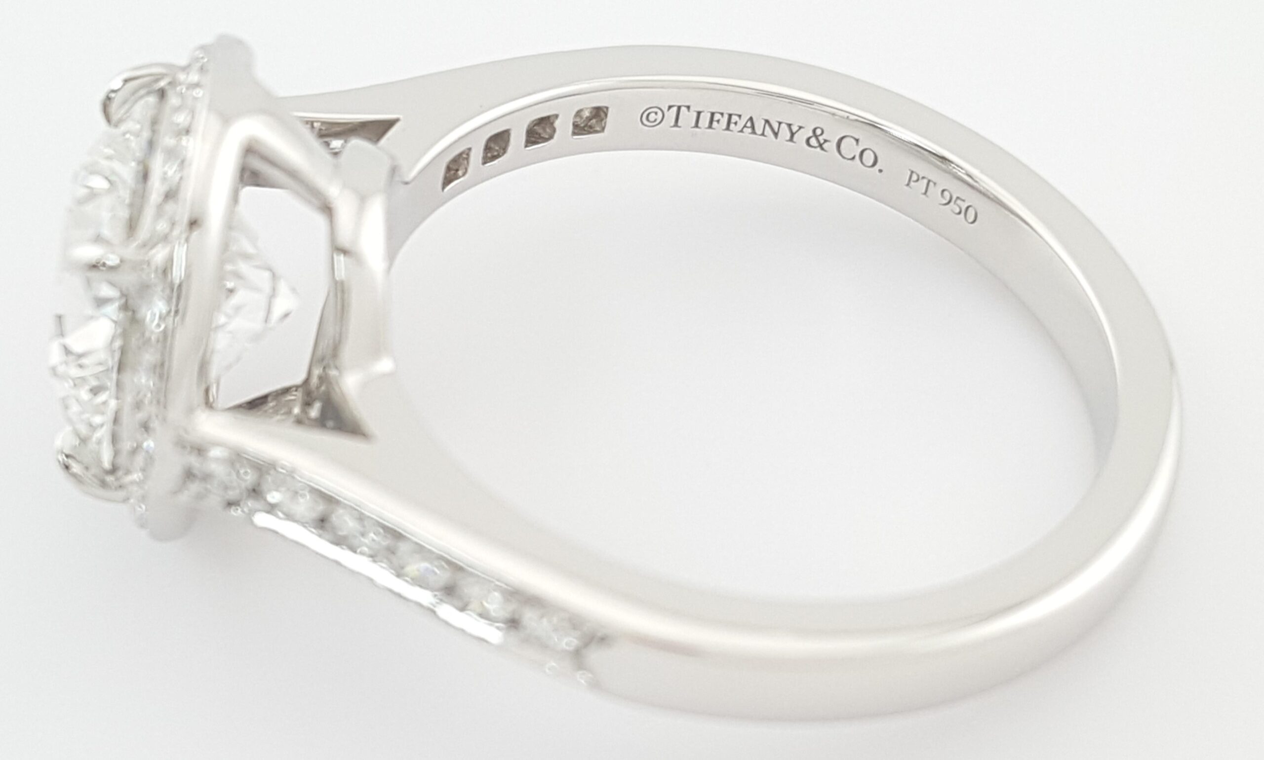The ring is stamped "©TIFFANY & CO. PT950" and "3634**** D2.11CT" to indicate the weight of the center diamond. Comes with Original Tiffany Diamond Report, Tiffany & Co. inner box & outer box.