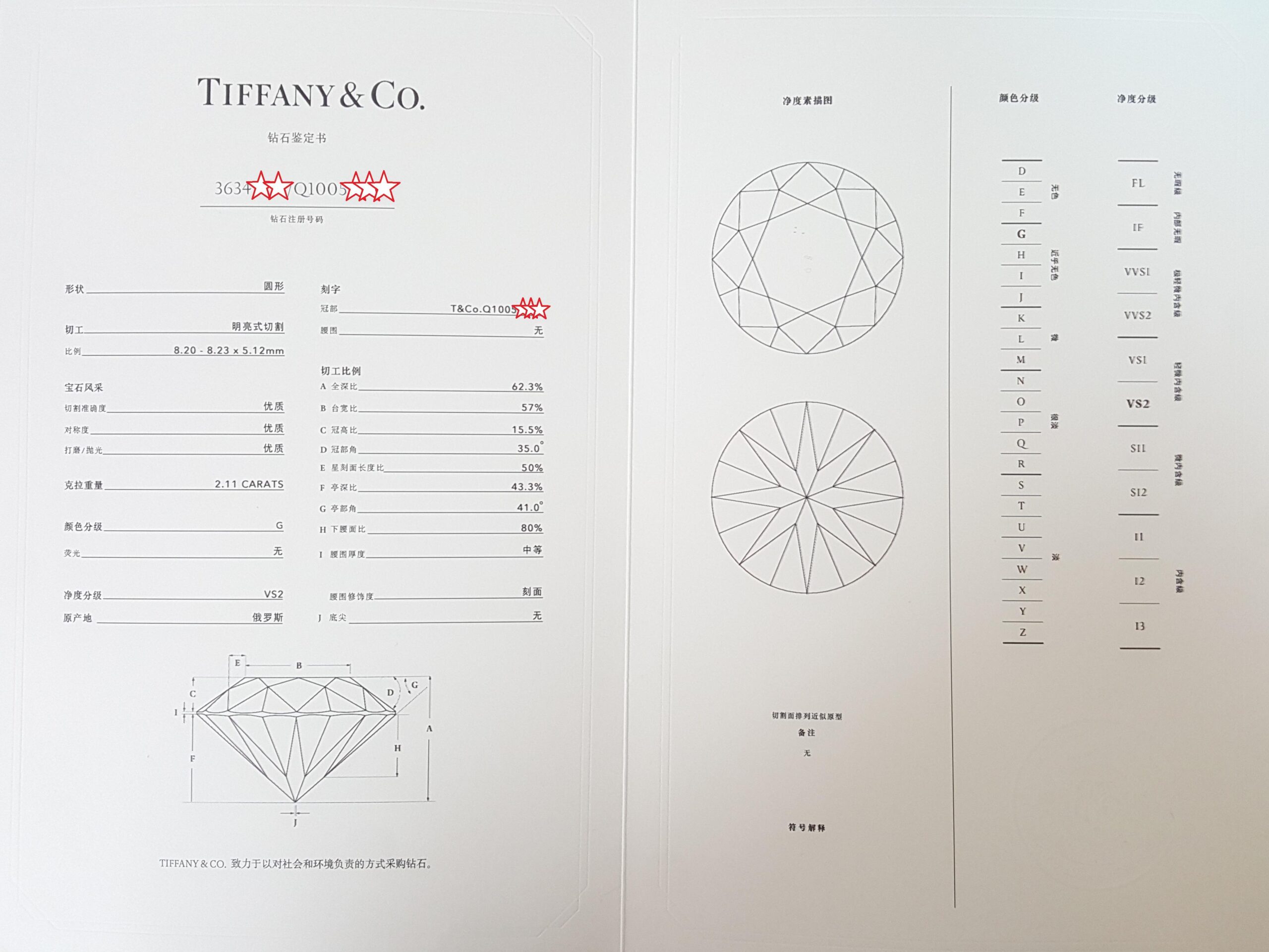 The ring weighs 6.1 grams, size 6, the center stone is a 2.11 ct Natural Round Brilliant Cut Diamond, G in color, VS2 in clarity, Excellent Cut, Excellent Symmetry, Excellent Polish, None Fluorescence with Crown inscription "T&Co.Q1005****".