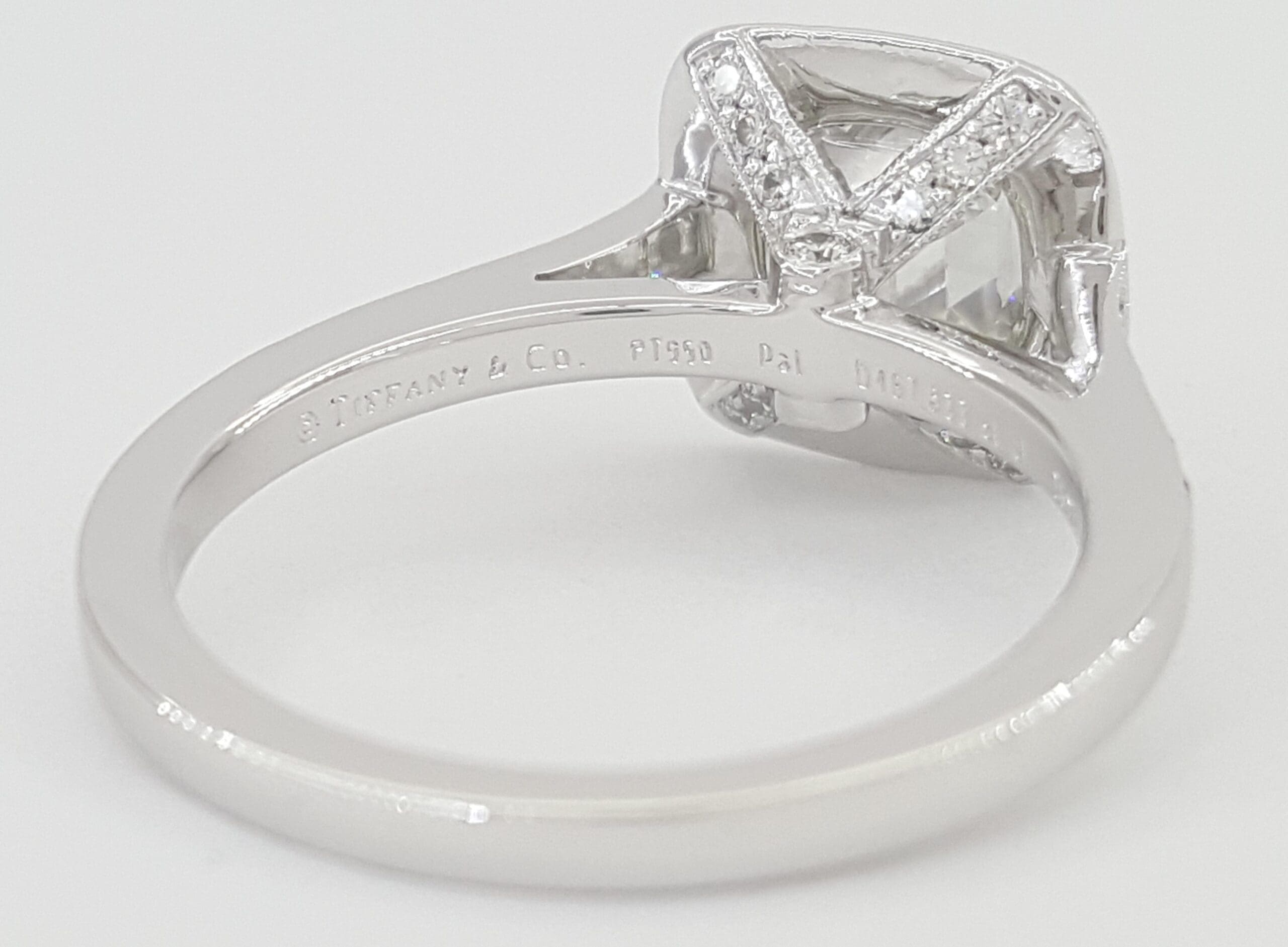 The ring is stamped "©TIFFANY&Co. PT950." and "Pat 467,833 et al 2632**** 1.72 CT"