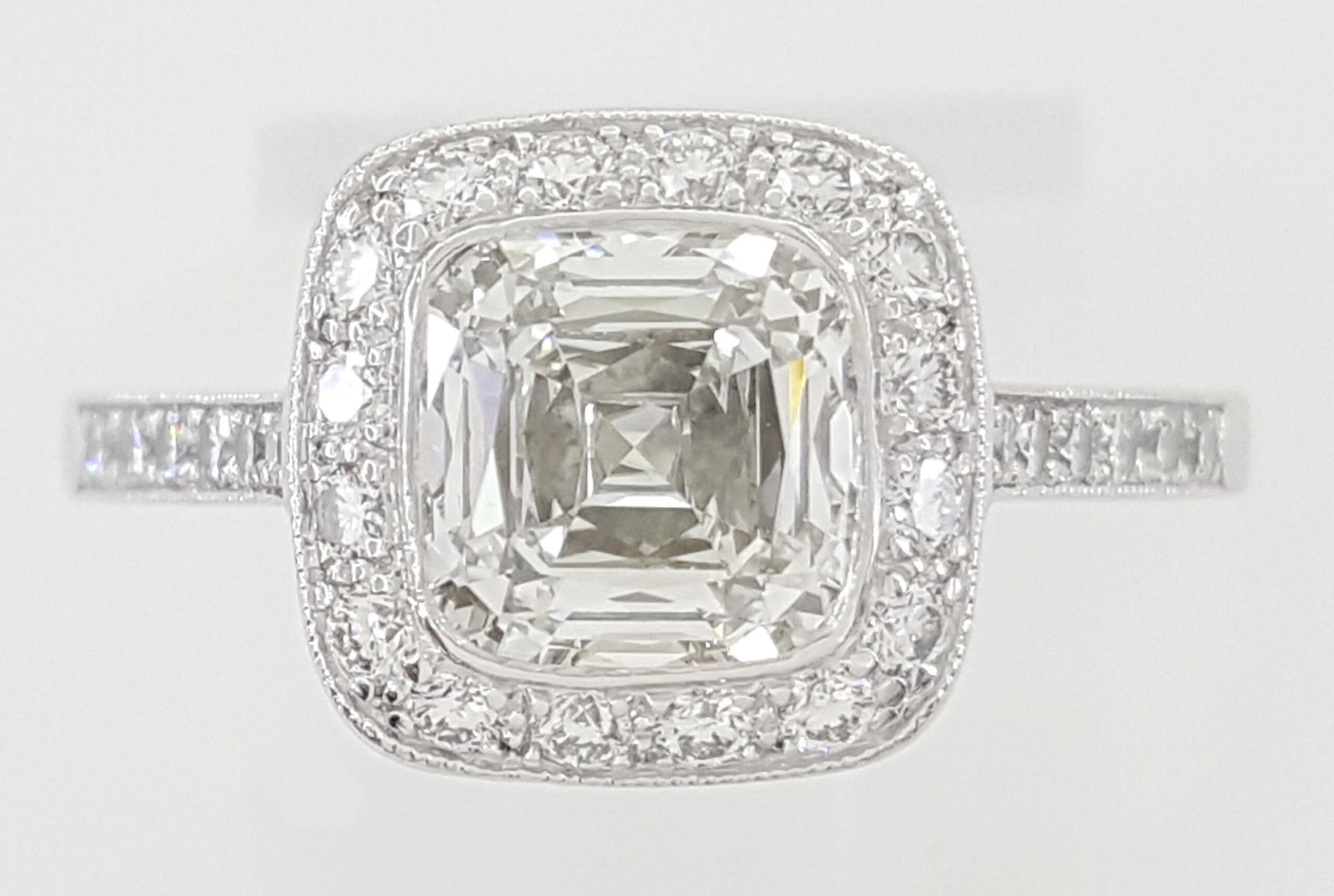 The ring weighs 5.8 grams, size 4.5, the center stone is a Legacy Cushion Brilliant Cut diamond weighing 1.72 ct, G in Color, VS1 in Clarity, None Fluorescence, Excellent cut, Very Good symmetry, & Excellent Polish, 6.59 x 6.56 x 4.32 mm. The Legacy Cushion cut is patented, it is only cut & sold by Tiffany & Co.