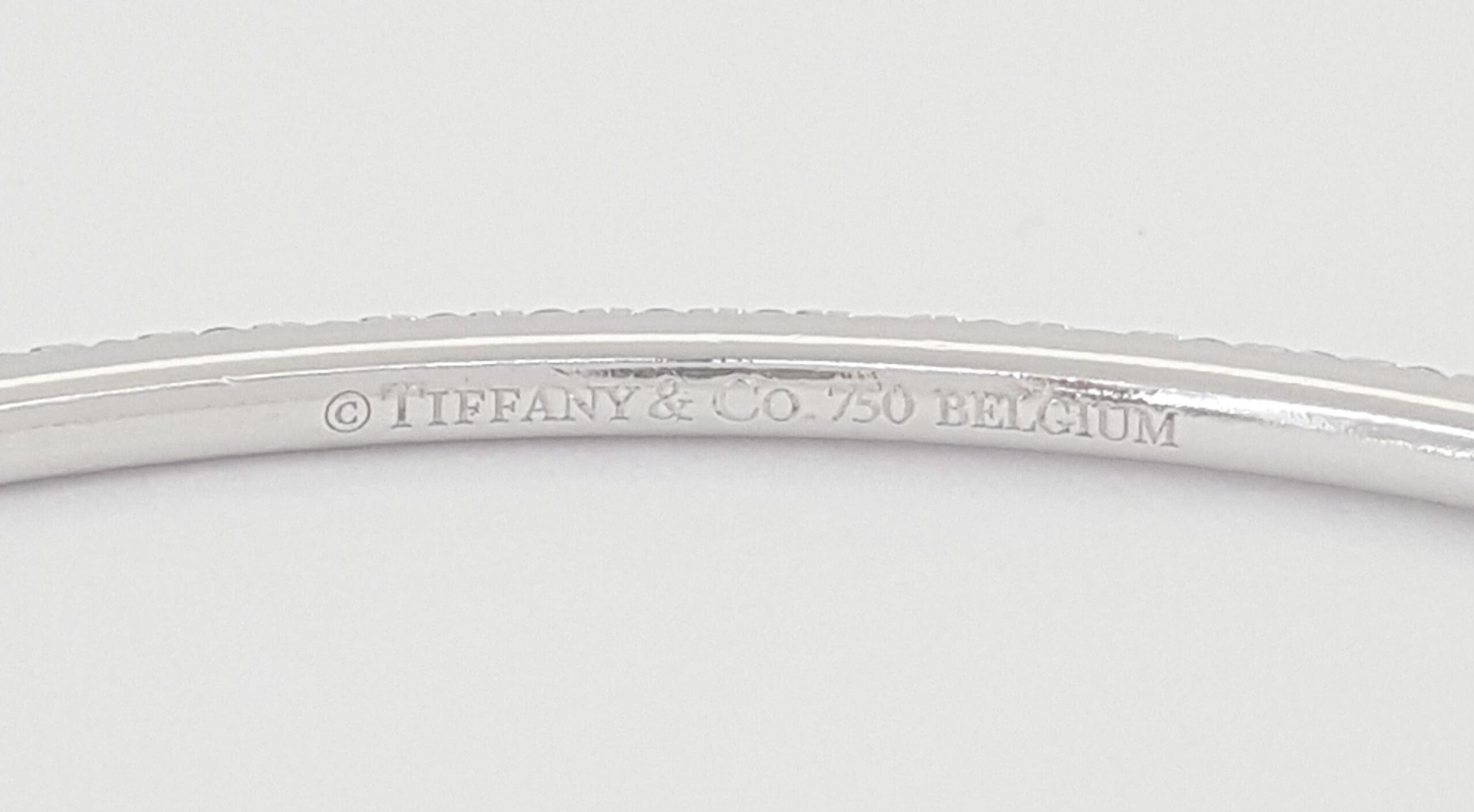 The bracelet is 2 mm wide, 2.5mm thick. The inside of the bracelet is stamped "Tiffany & Co. 750 Belgium".