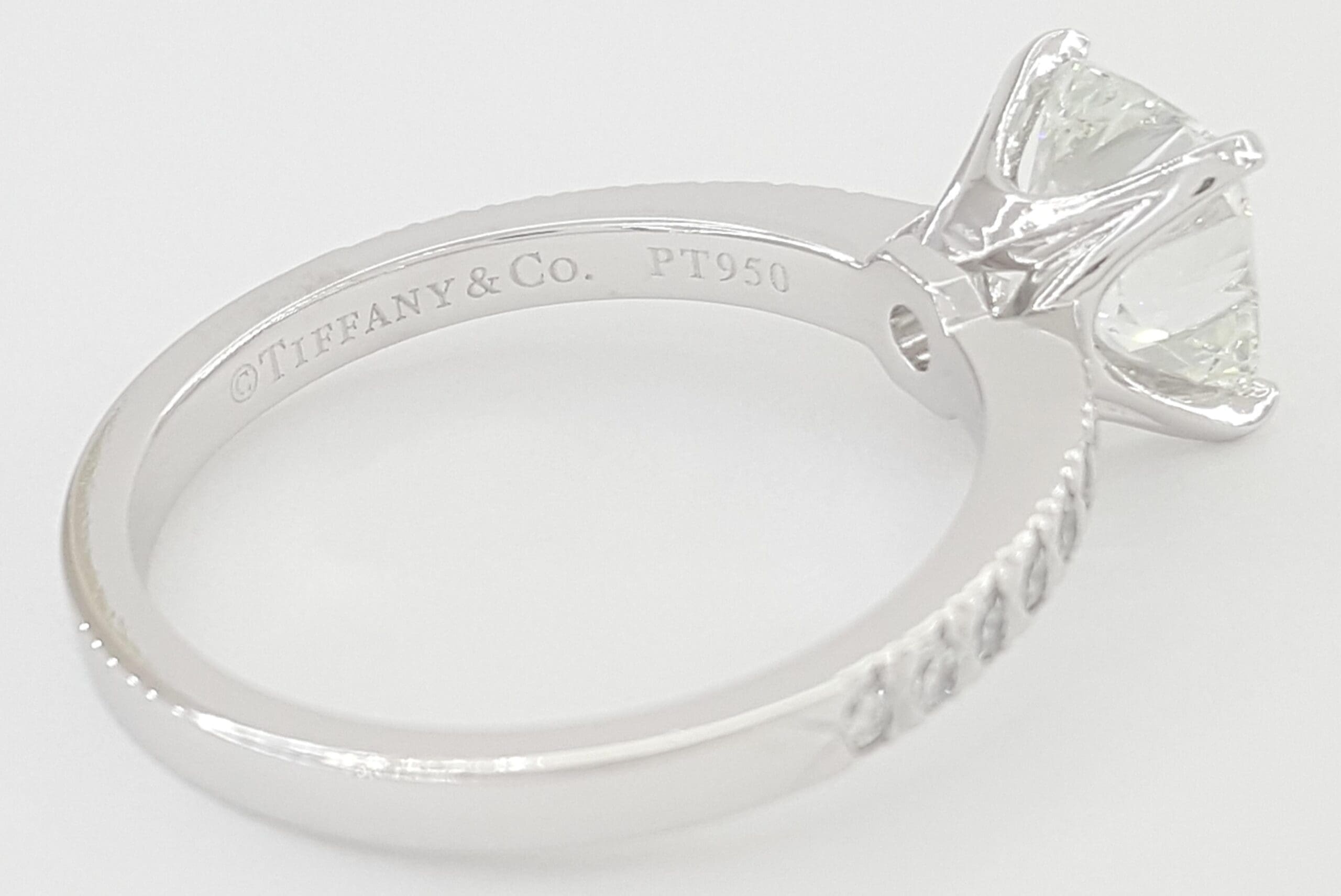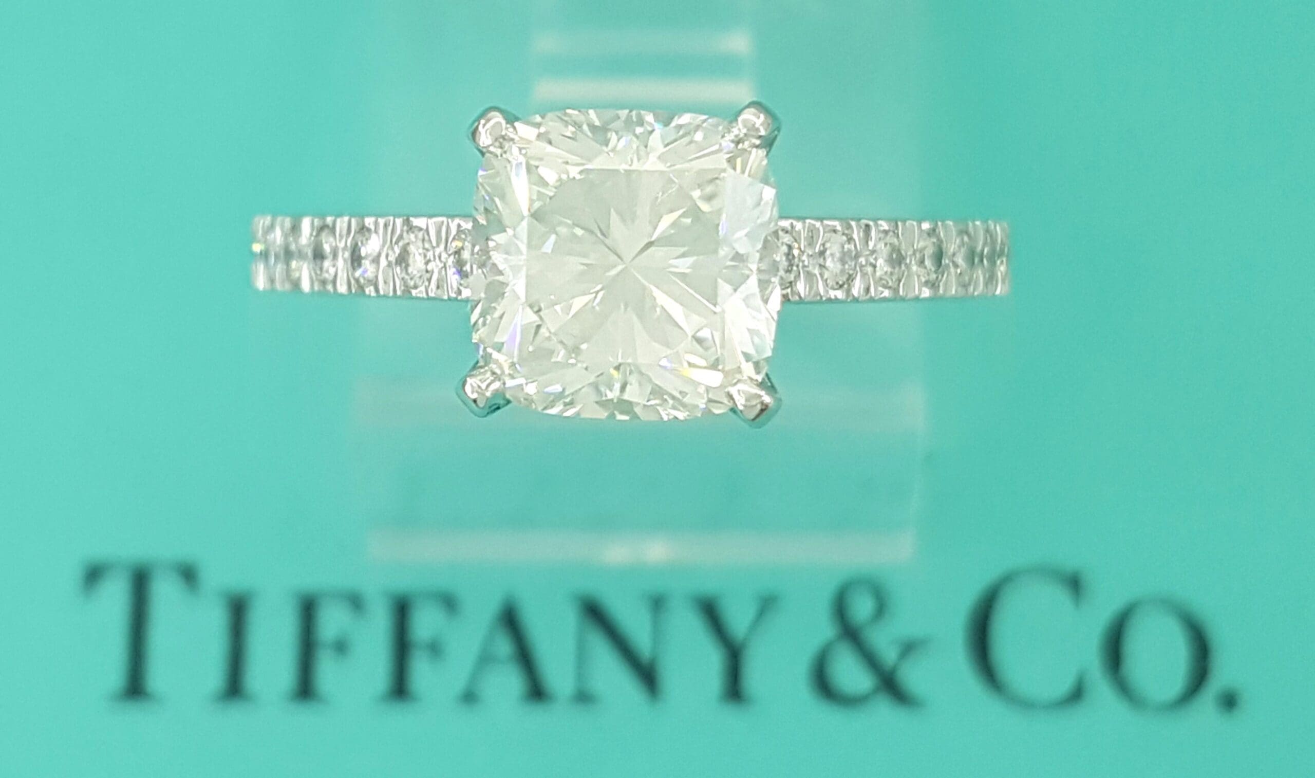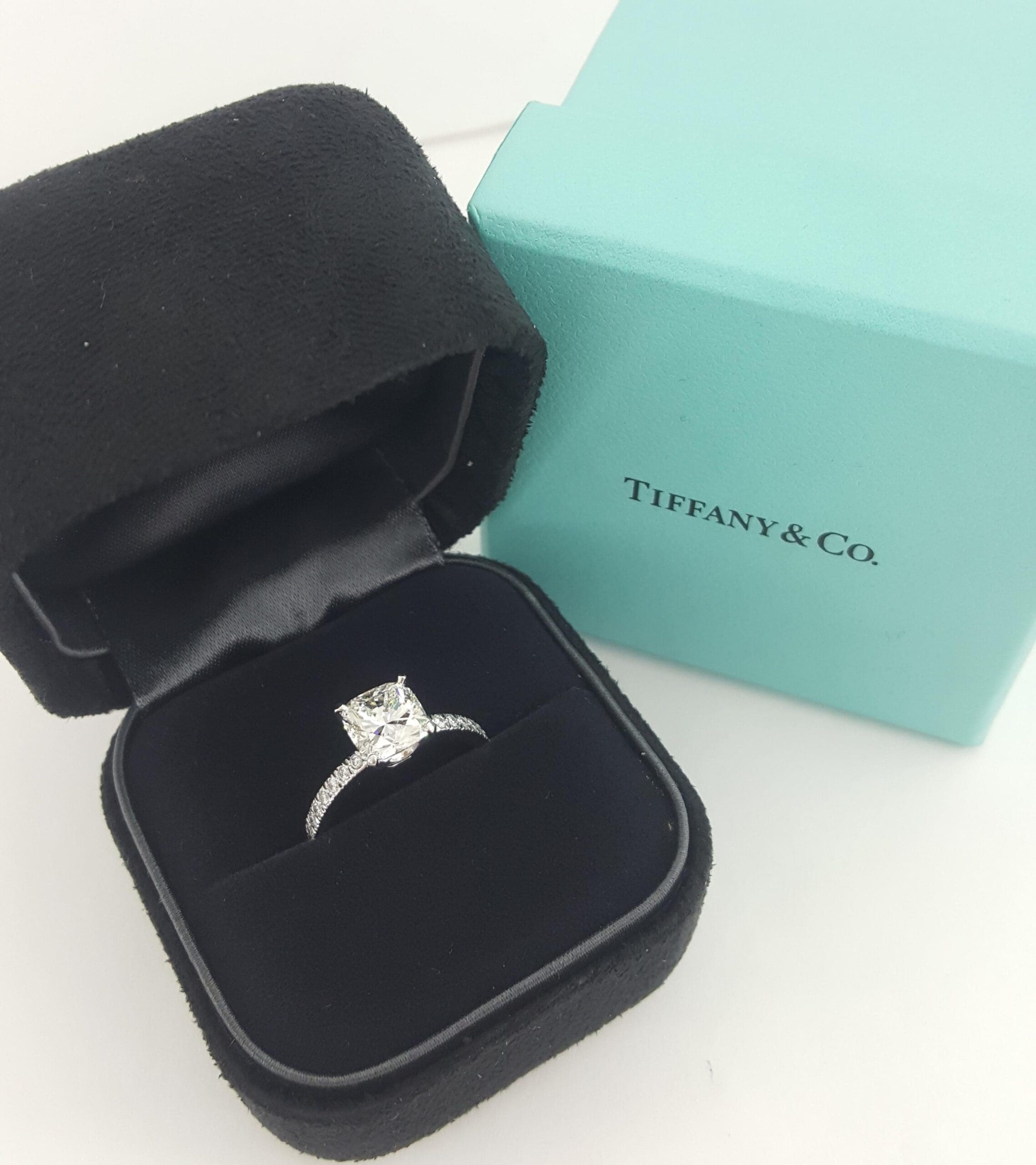 You are Buying an Authentic Tiffany & Co. Platinum Novo® 1.67 ct Cushion Cut Diamond Engagement Ring