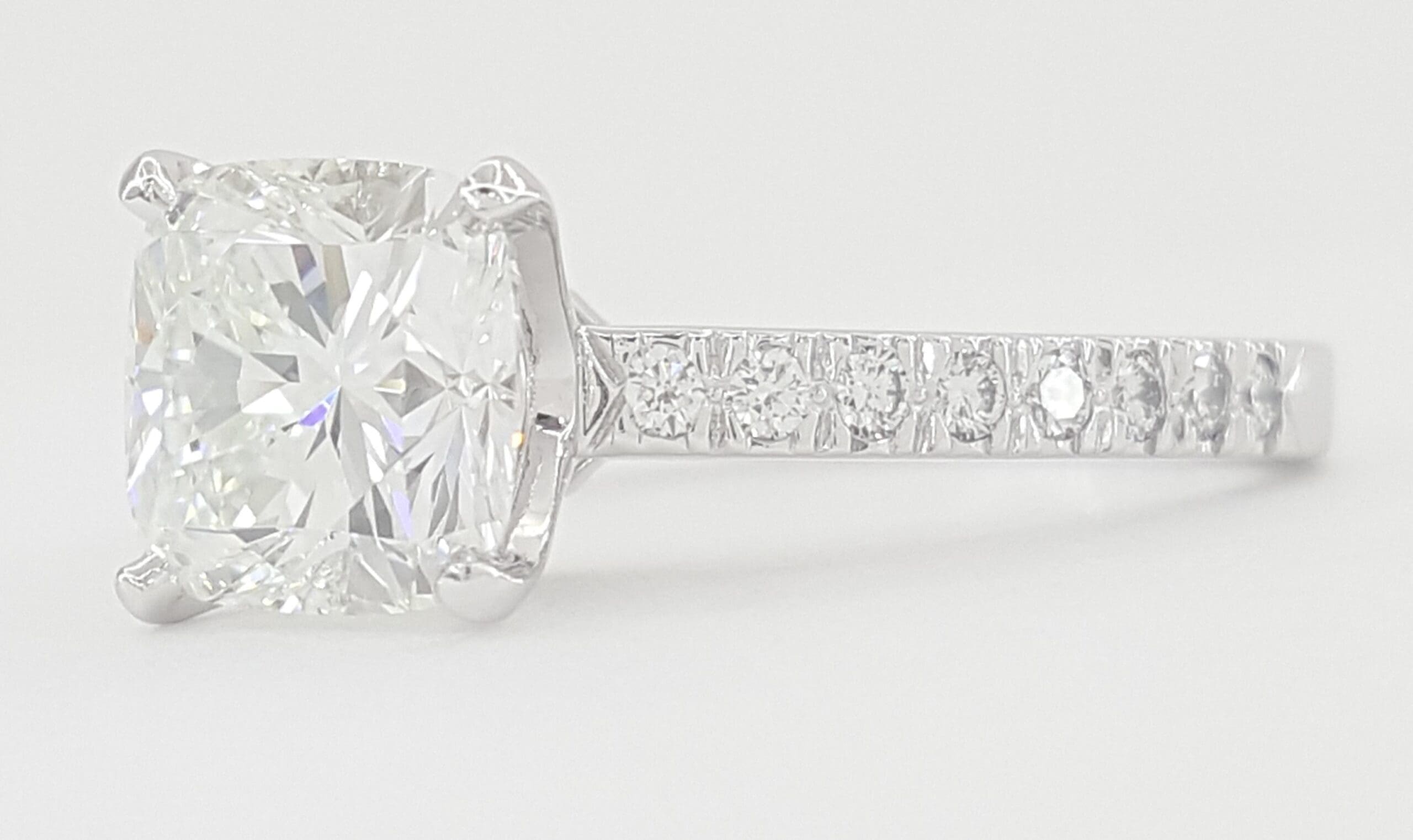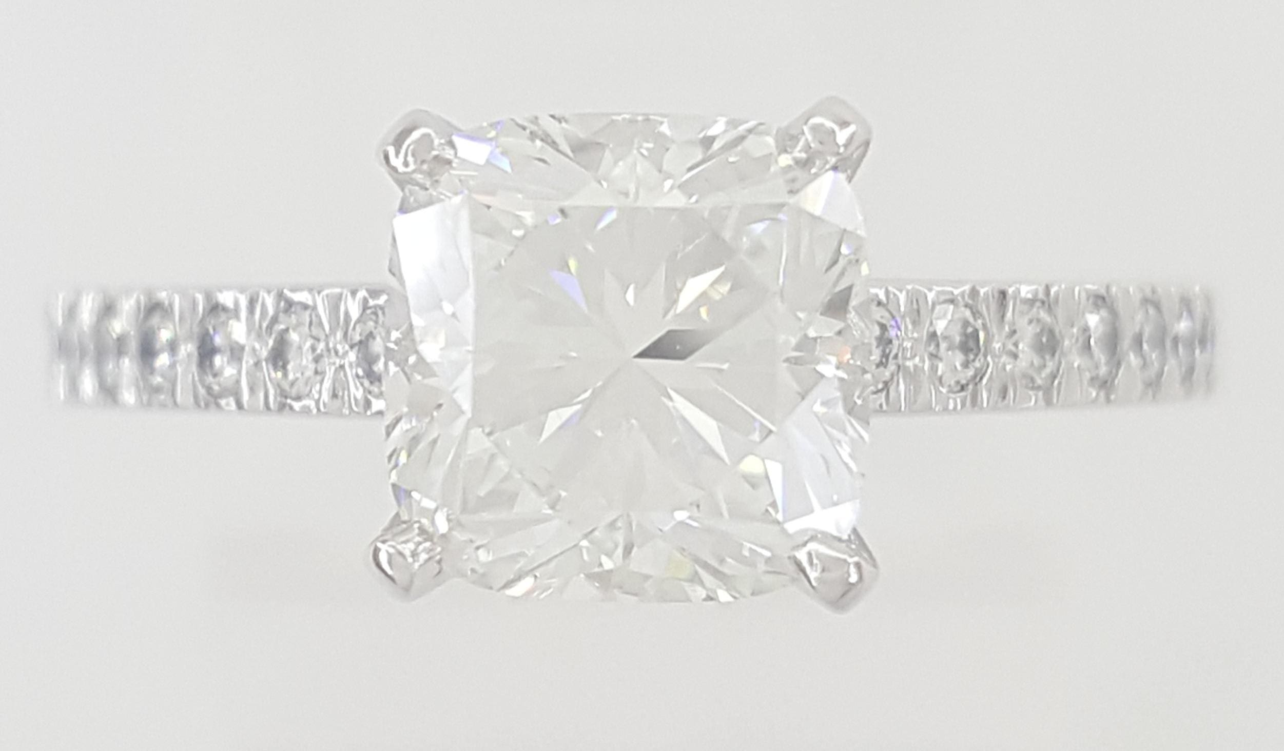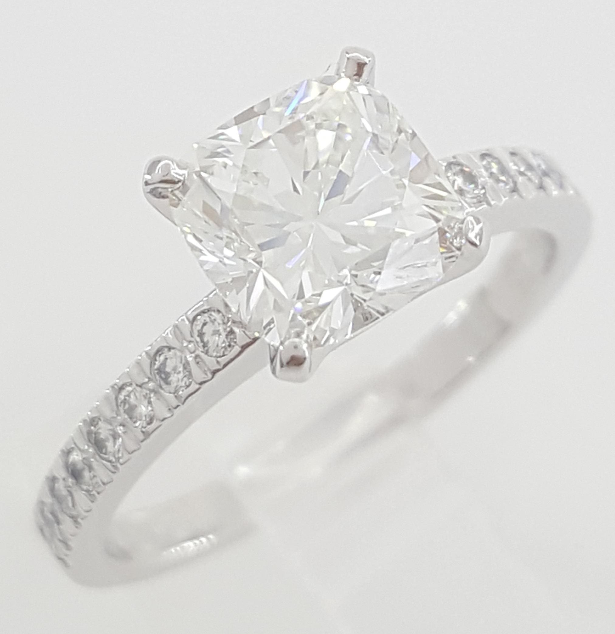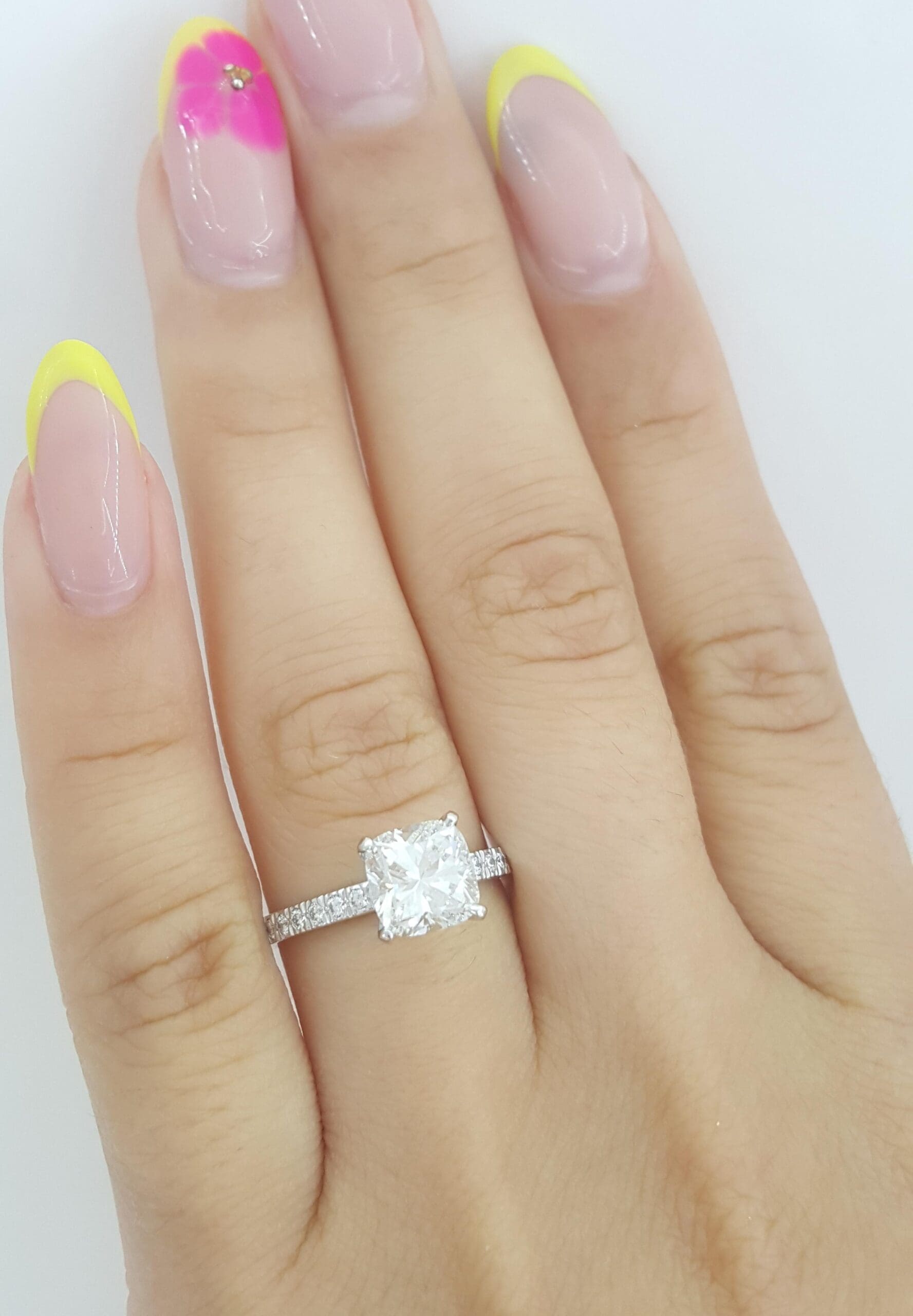 You are Buying an Authentic Tiffany & Co. Platinum Novo® 1.67 ct Cushion Cut Diamond Engagement Ring