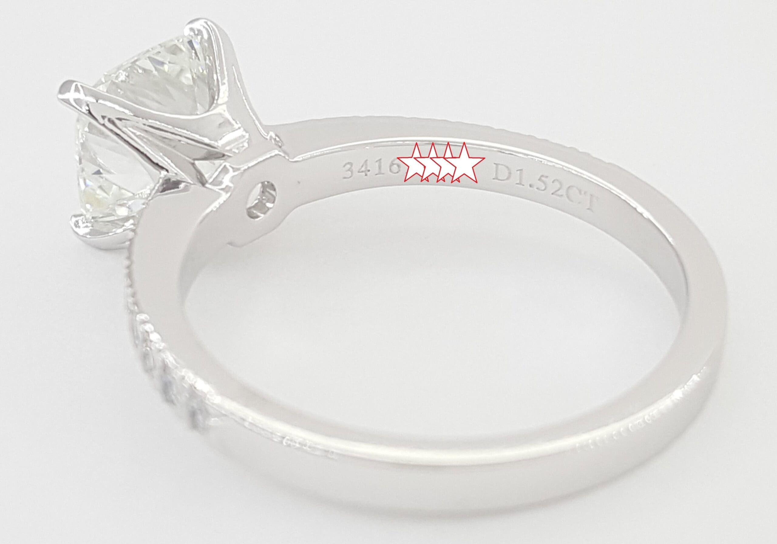 The ring is stamped "©TIFFANY & CO. PT950" and "3416**** D 1.52 CT" to indicate the weight of the center diamond.