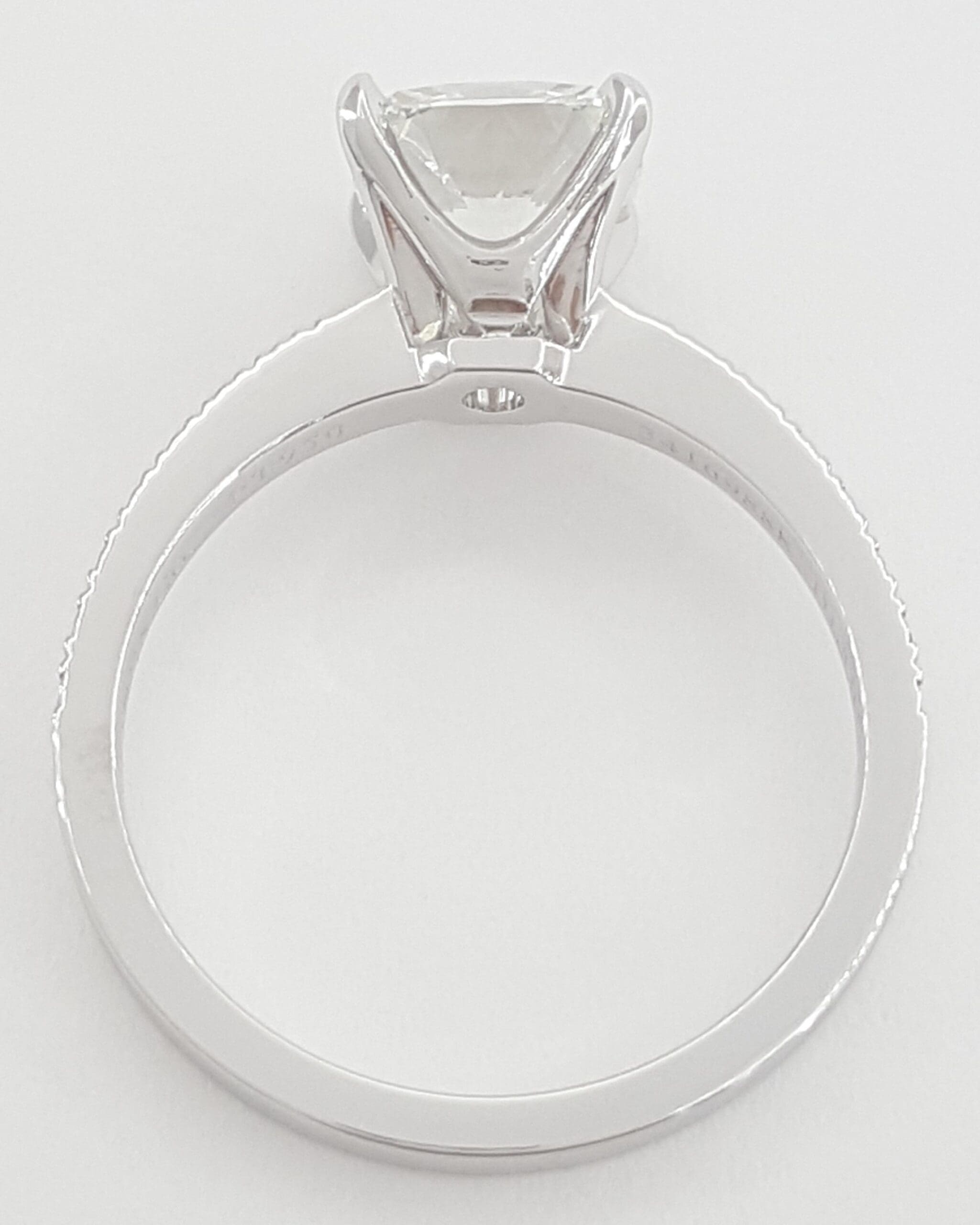 The ring weighs 4.5 grams, size 6, the center stone is a Natural Cushion Cut Diamond weighing 1.52 ct, H in color, VS1 in clarity, Excellent Cut, with Crown inscription "T&Co.P0627****".