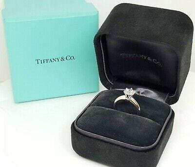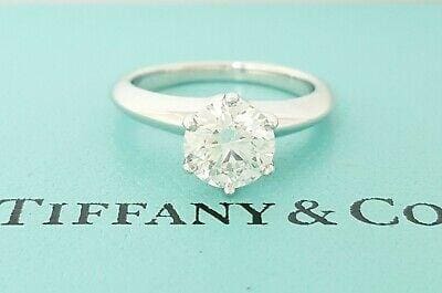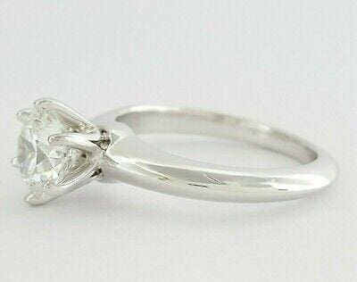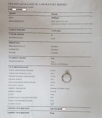 The ring weighs 5.7 grams, size 4.5, the center stone is a Round Brilliant Cut diamond weighing 1.11 ct, F in color, VS1 in clarity with measurements 6.60-6.65 x 4.11 mm with Excellent cut, Excellent symmetry, and Excellent polish with None fluorescence. The diamond has crown inscriptions "T&C0.L052****". The ring is stamped "TIFFANY & CO. PT 950 27810*** 1.11CT". The current retail replacement value at Tiffany is approximately $20,600 + Tax! The Ring will come with Tiffany & Co. inner & outer ring box, Copy of T&Co. Diamond Report. Please follow us on Instagram for more unique items & specials: Exquisite_Jewelers_Inc. The ring can be seen in person at Exquisite Jewelers in Palatine, IL * 8 47 * 202 * 7889.