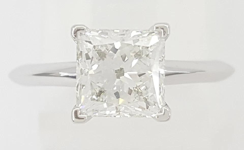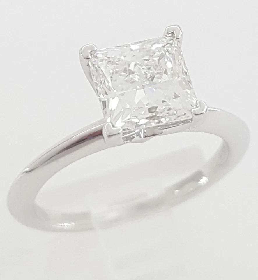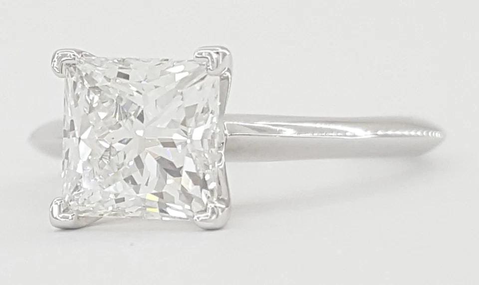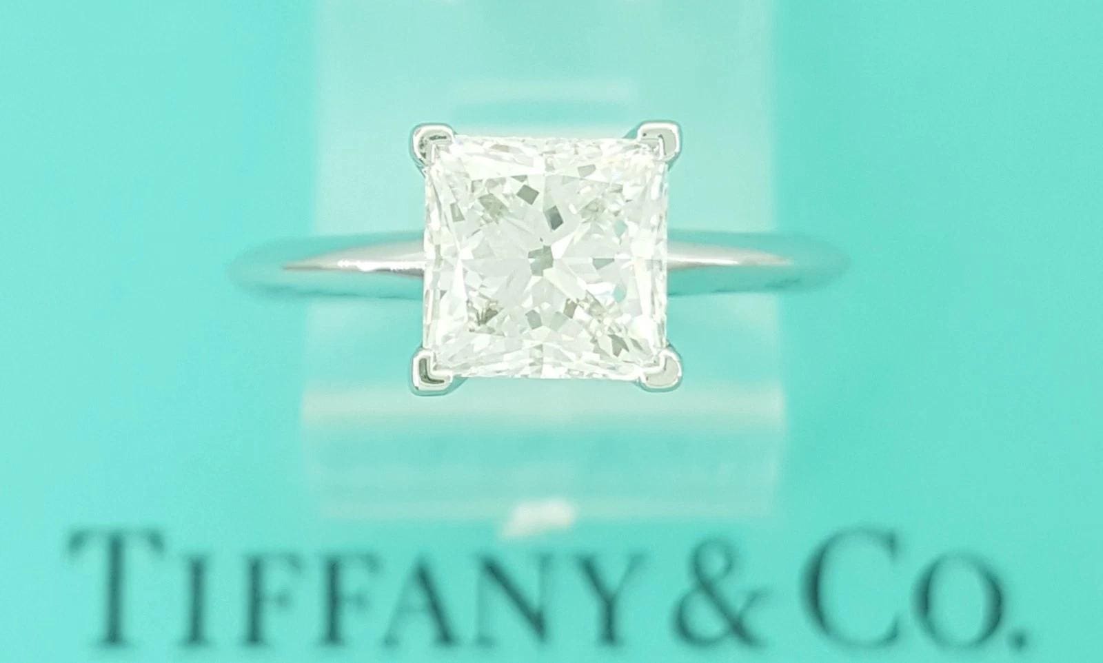 You are Buying an Authentic Tiffany & Co. 1.56 ct Platinum Princess Brilliant Cut Diamond Solitaire Engagement Ring.
