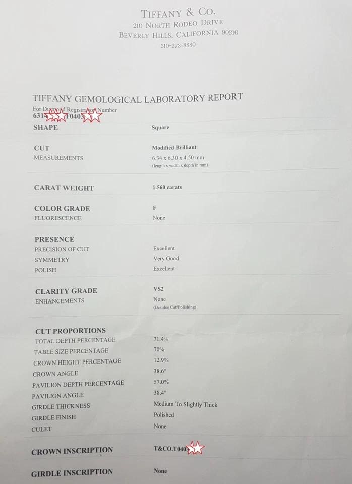 The ring weighs 4.2 grams, size 4.75, the center stone is a Princess Brilliant Cut diamond weighing 1.56 ct, F in color, VS2 in clarity. Excellent Cut, Excellent polish, Very Good symmetry, and None fluorescence. The diamond has Crown Inscription of "T&Co.T0403****".