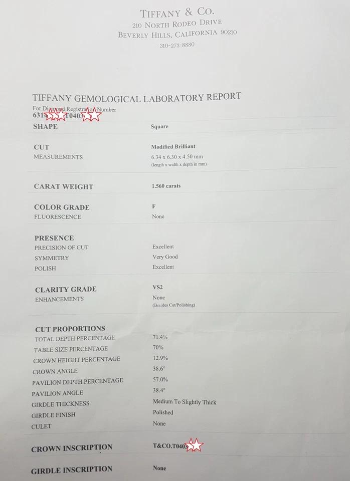 The ring weighs 4.2 grams, size 4.75, the center stone is a Princess Brilliant Cut diamond weighing 1.56 ct, F in color, VS2 in clarity. Excellent Cut, Excellent polish, Very Good symmetry, and None fluorescence. The diamond has Crown Inscription of "T&Co.T0403****".