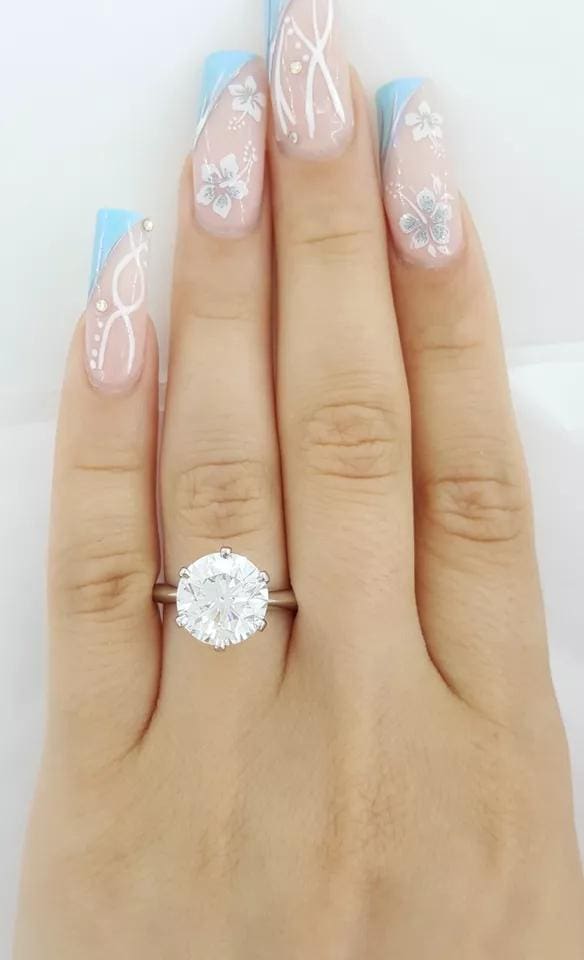 The ring weighs 8.5 grams, size 6.5 (sizable to most finger size), the center stone is a 4.49 ct Natural Round Brilliant Cut diamond, G in color, VS1 in clarity, Very Good Cut, Very Good Polish, Good Symmetry & Medium Blue Fluorescence.