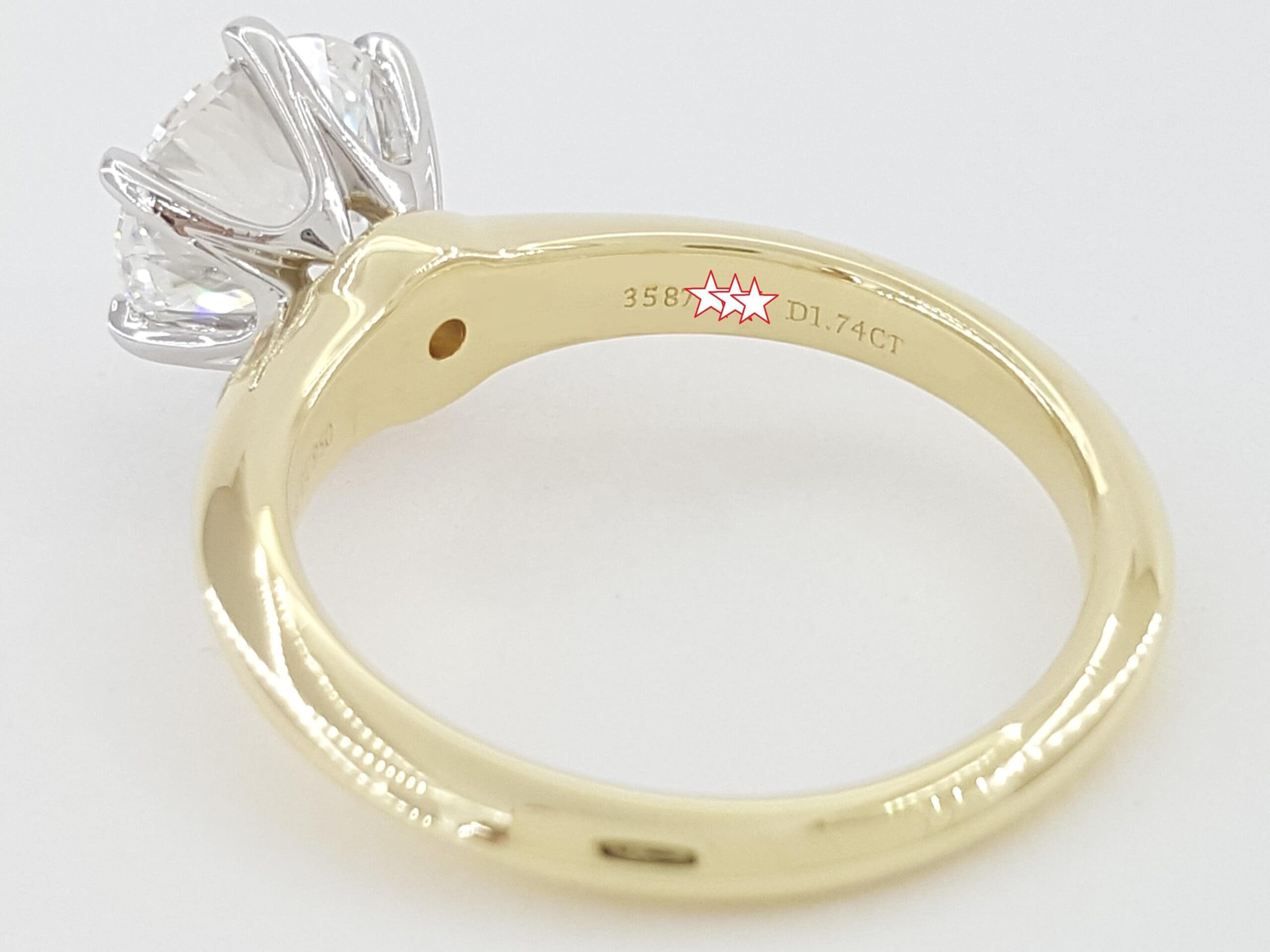 The ring is stamped "©TIFFANY & CO. Au 750 PT 950" & "3587**** D1.74 CT".