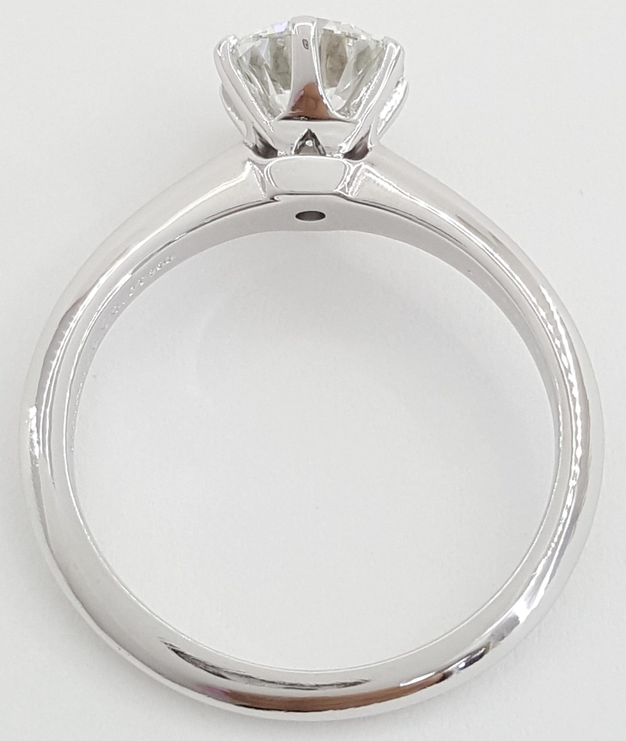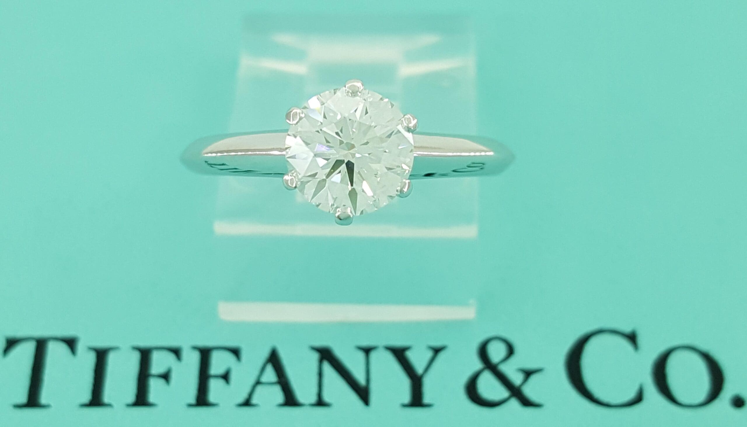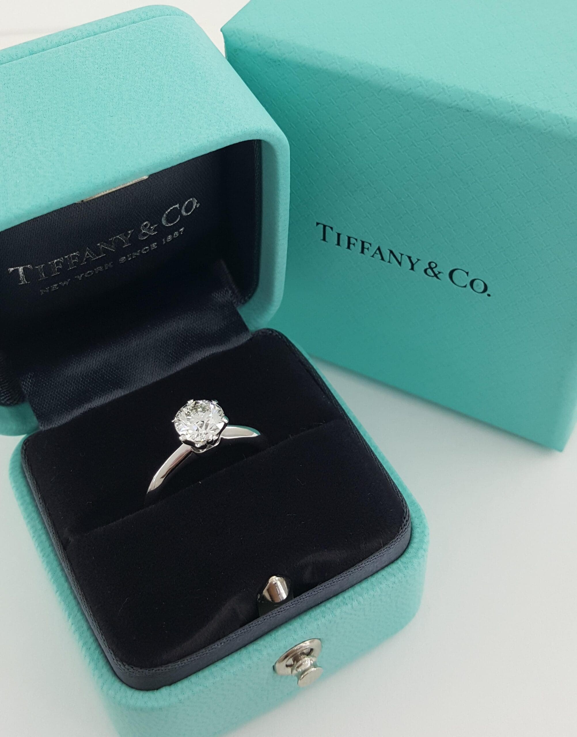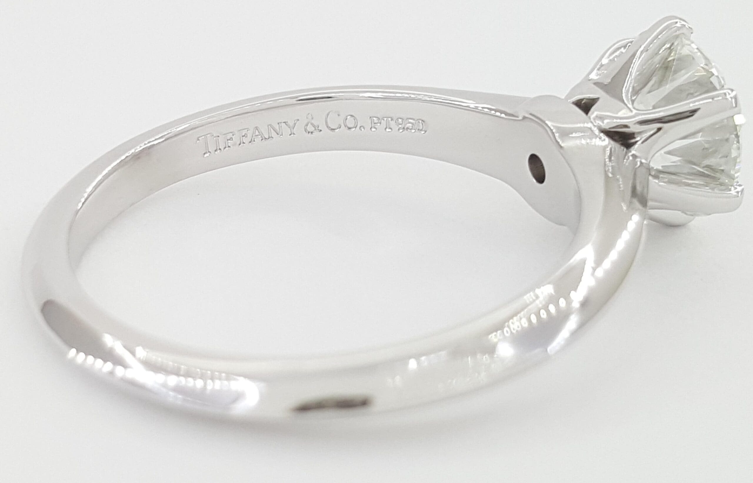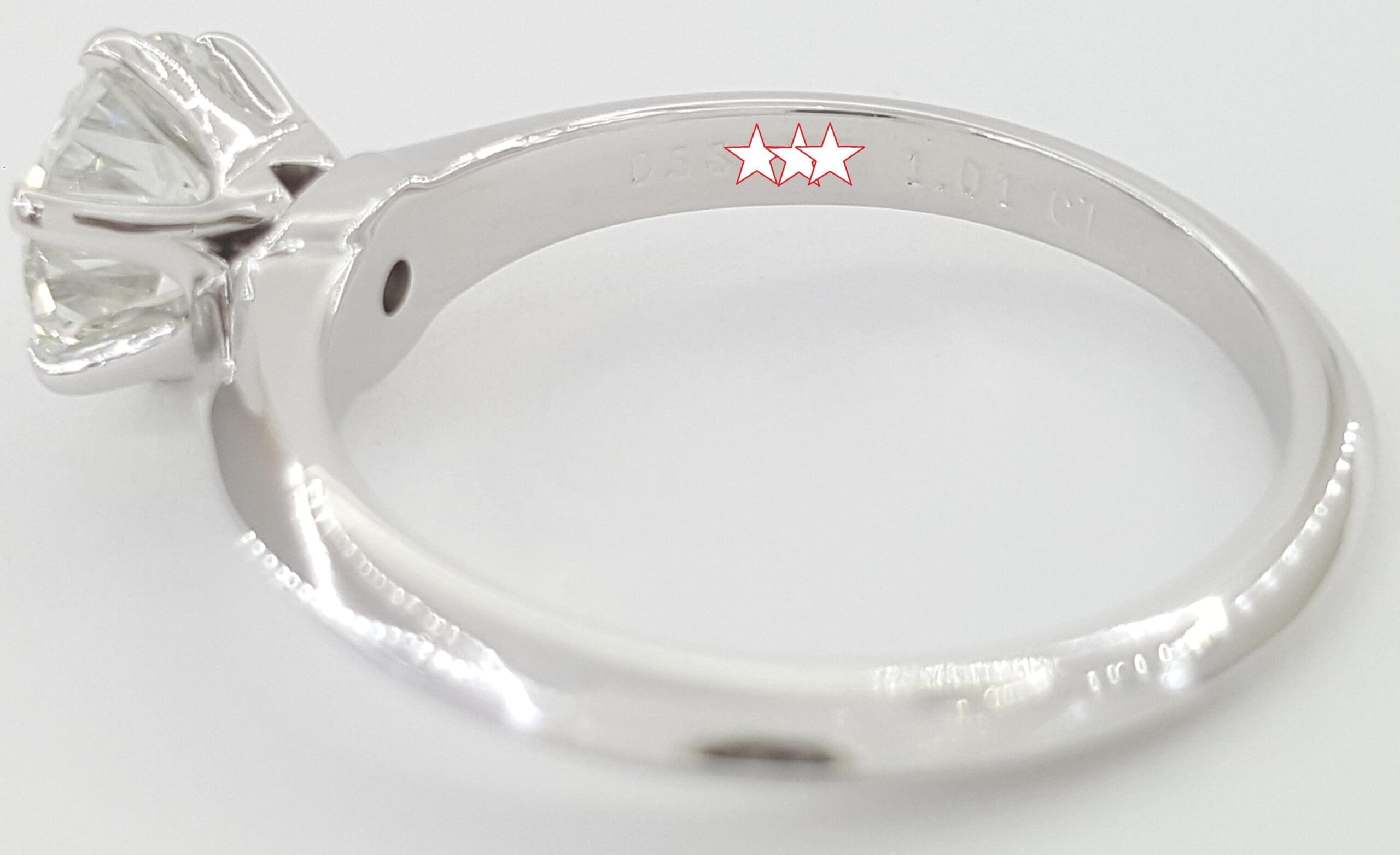 The ring is stamped "©TIFFANY & CO. PT 950 D55**** D1.01CT".