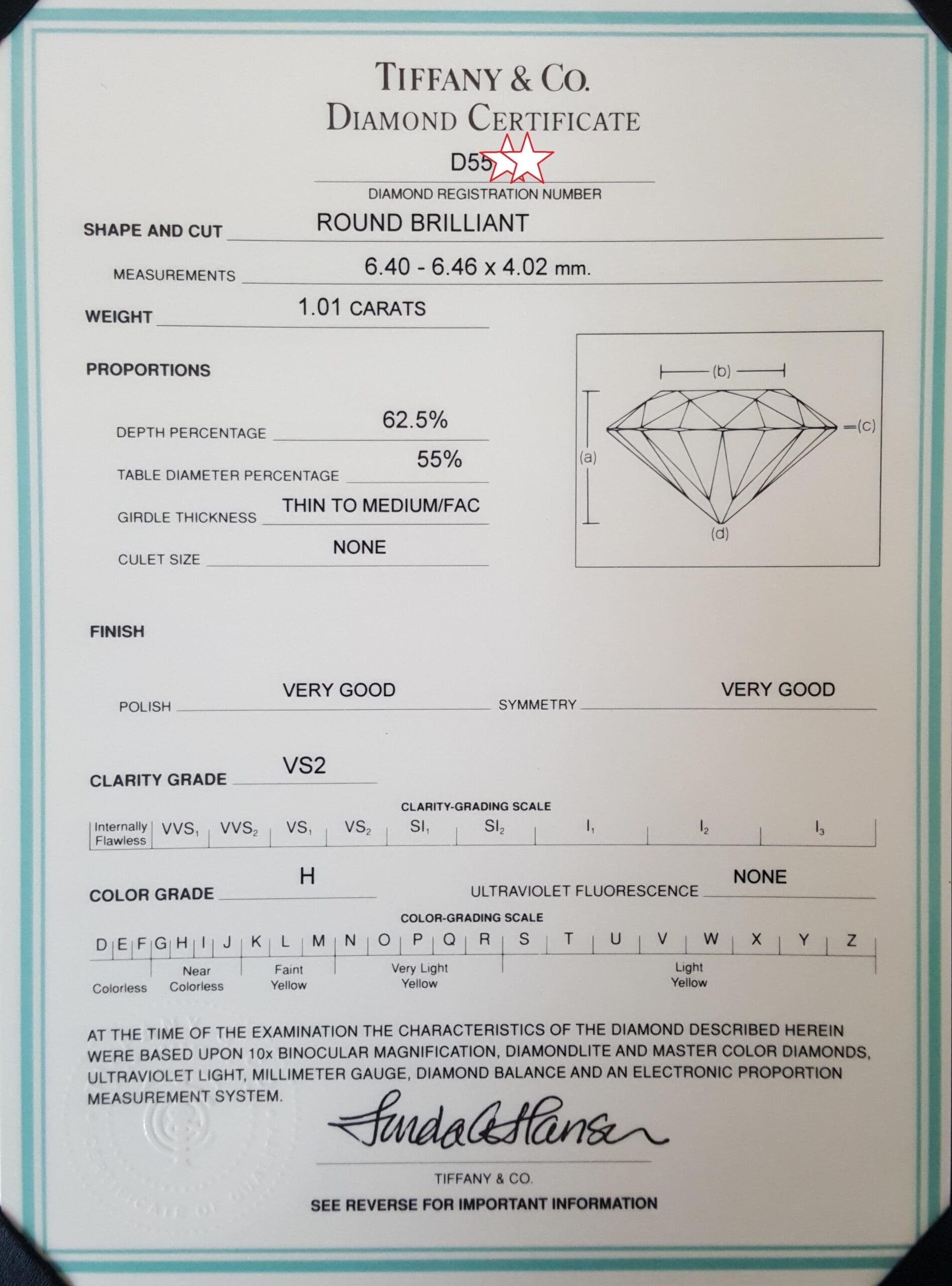 Tiffany & Co Round Diamond Solitaire Platinum Engagement Ring 1.01 ct Rtl $15.8k