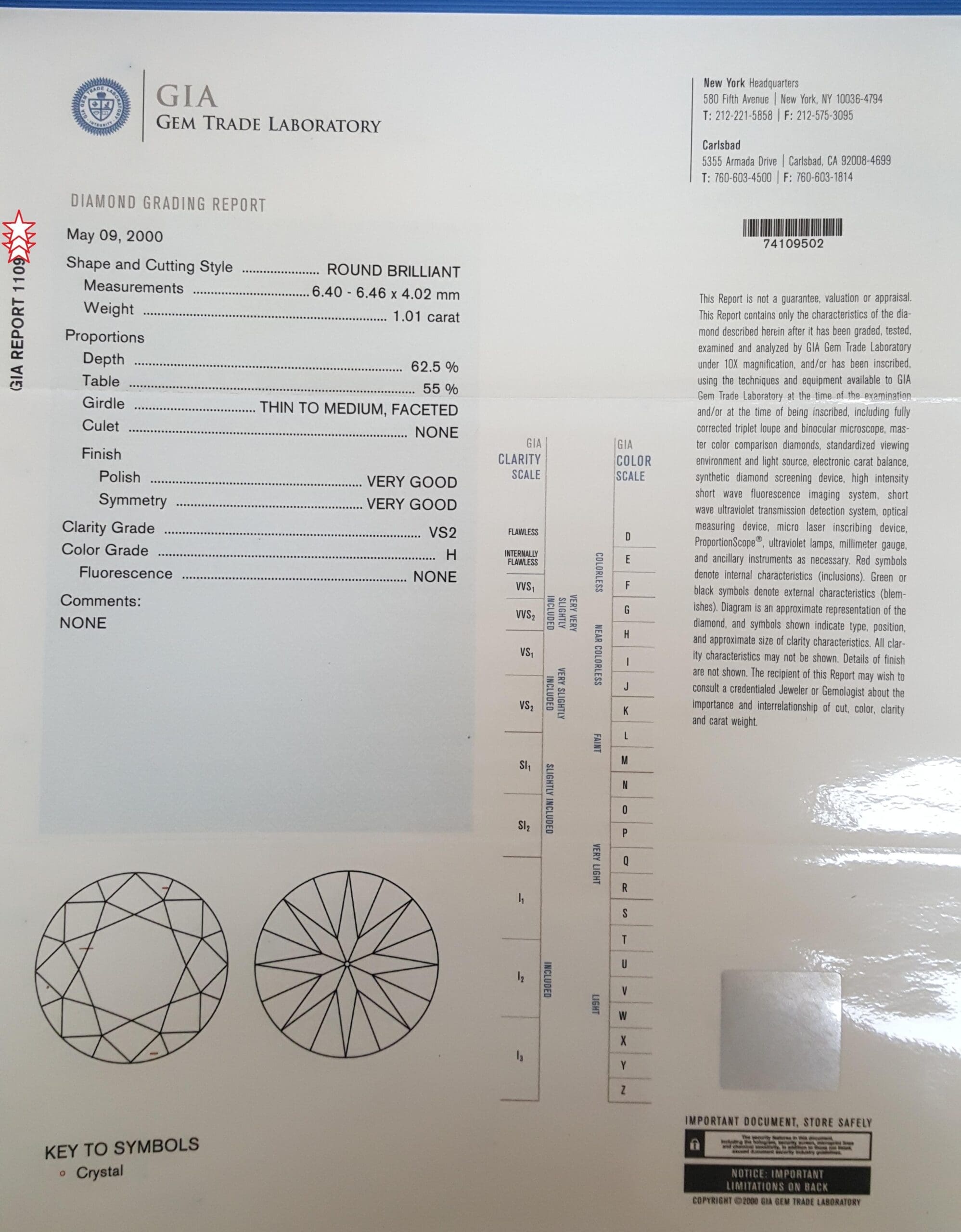 The ring weighs 4.2 grams, size 5 (can be resized to any size), the center stone is a 1.01 ct Natural Round Brilliant Cut diamond, H in color, VS2 in clarity, Very Good Polish, Very Good Symmetry, measuring 6.40-6.46 x4.02 mm.