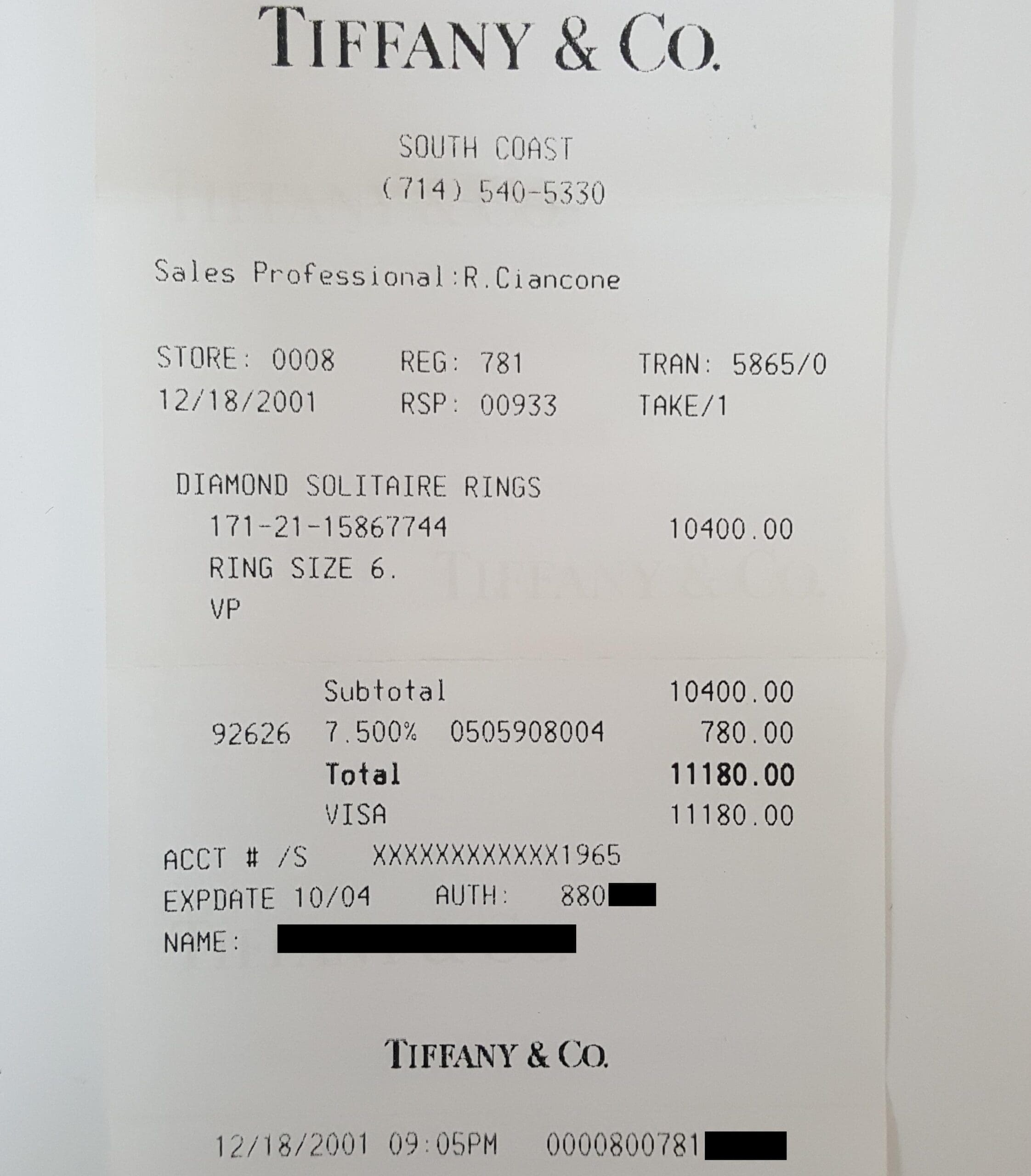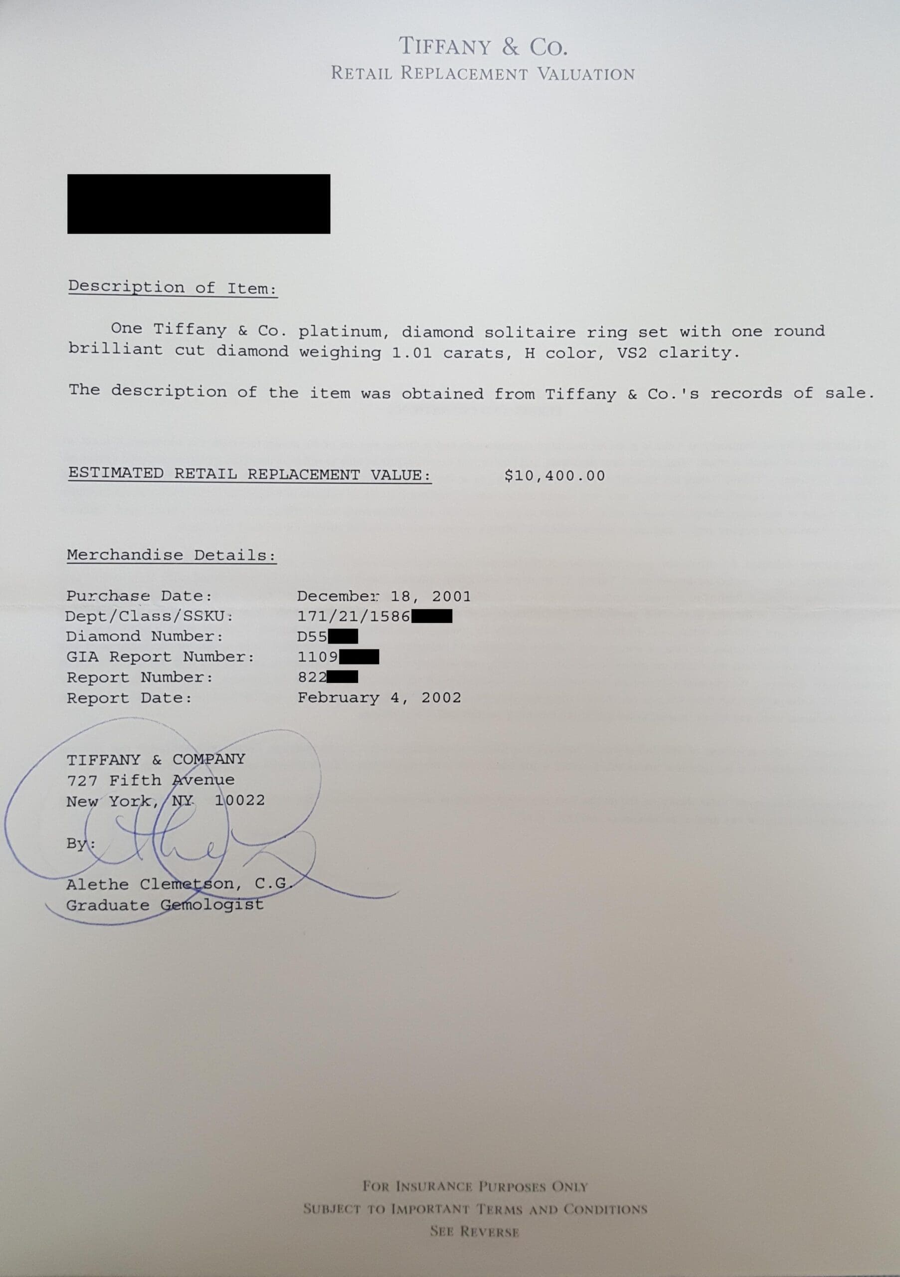 The Ring was sold for $10,400 + tax in December 2001, the Current retail replacement value of this ring is $15,800 + tax at Tiffany.