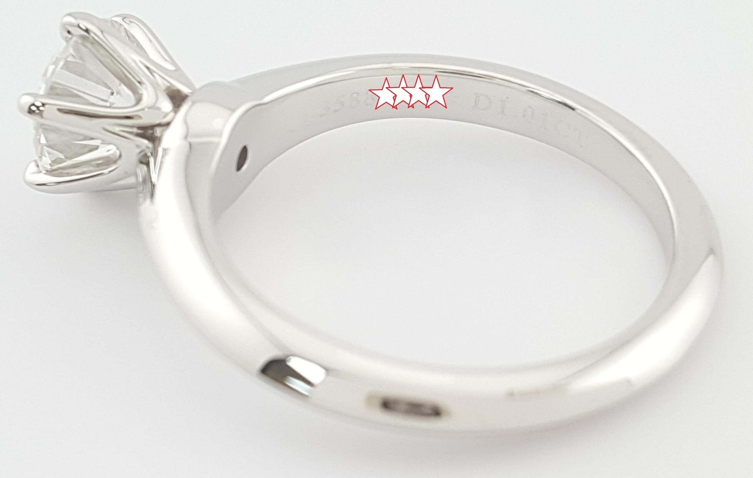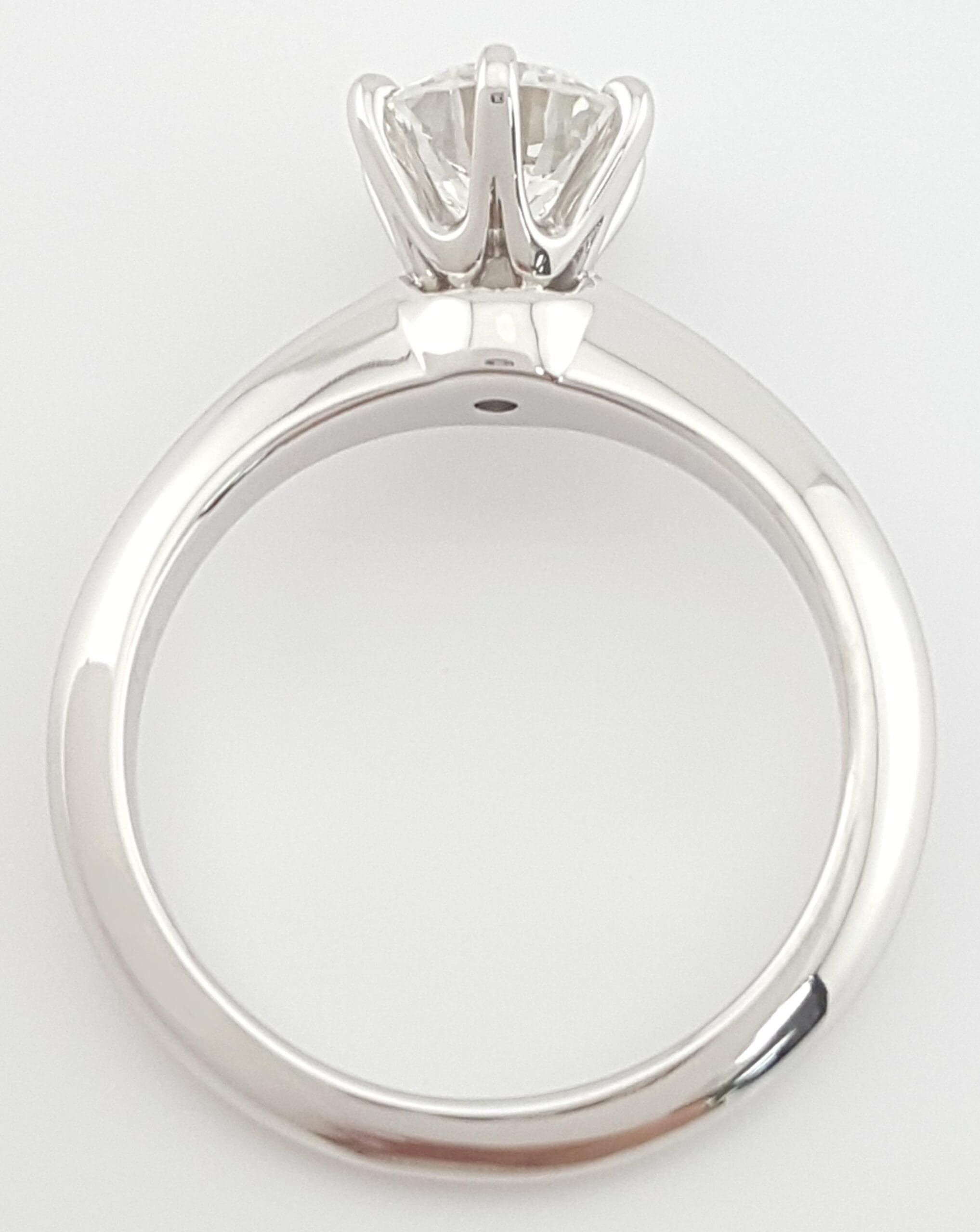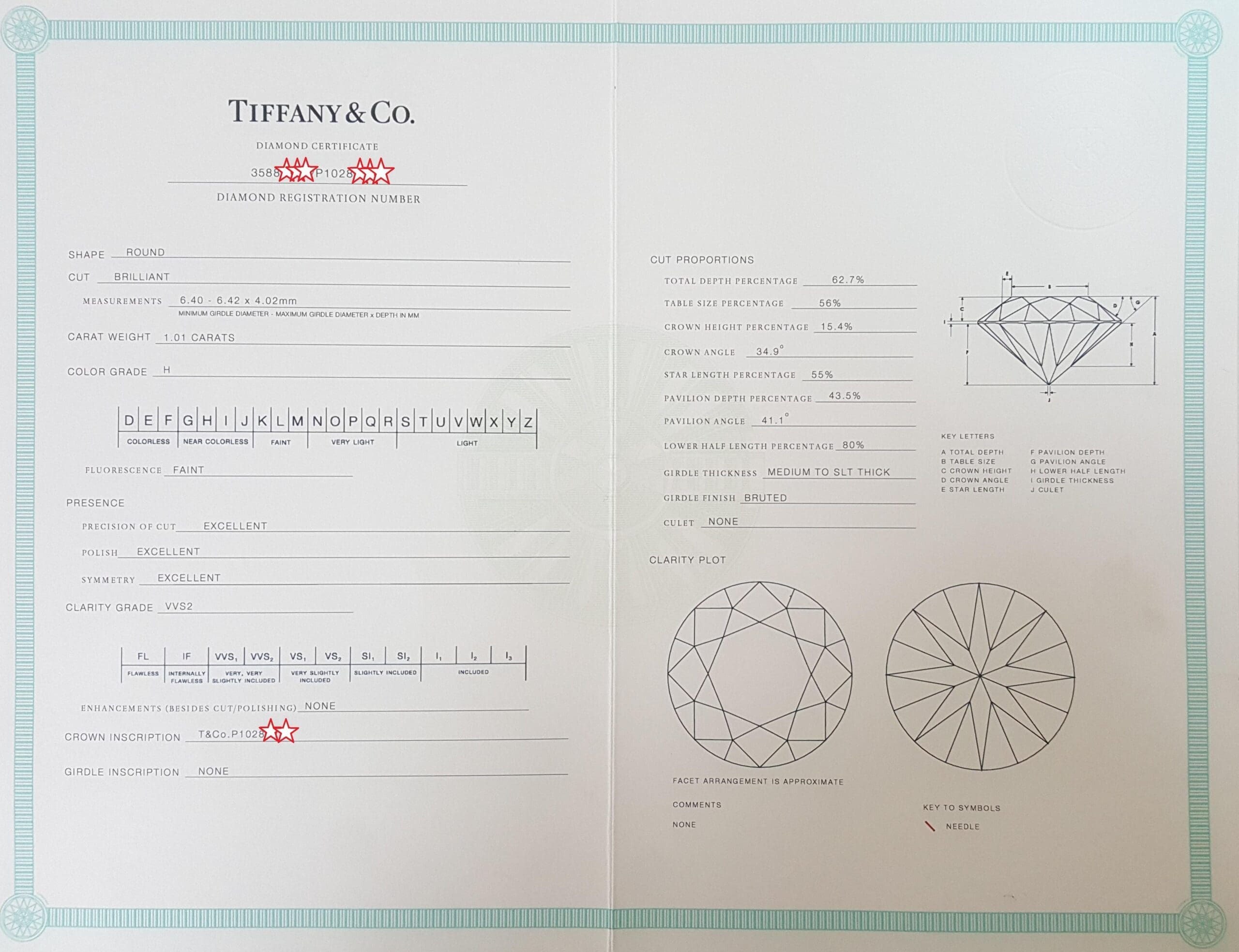 The ring weighs 5.6 grams, size 5 (can be resized to any size), the center stone is a 1.01 ct Natural Round Brilliant Cut diamond, H in color, VVS2 in clarity, Excellent Cut, Excellent Polish, Excellent Symmetry, None Fluorescence, measuring 6.40-6.42x4.02mm, with Crown inscription "T&Co.P1028****"