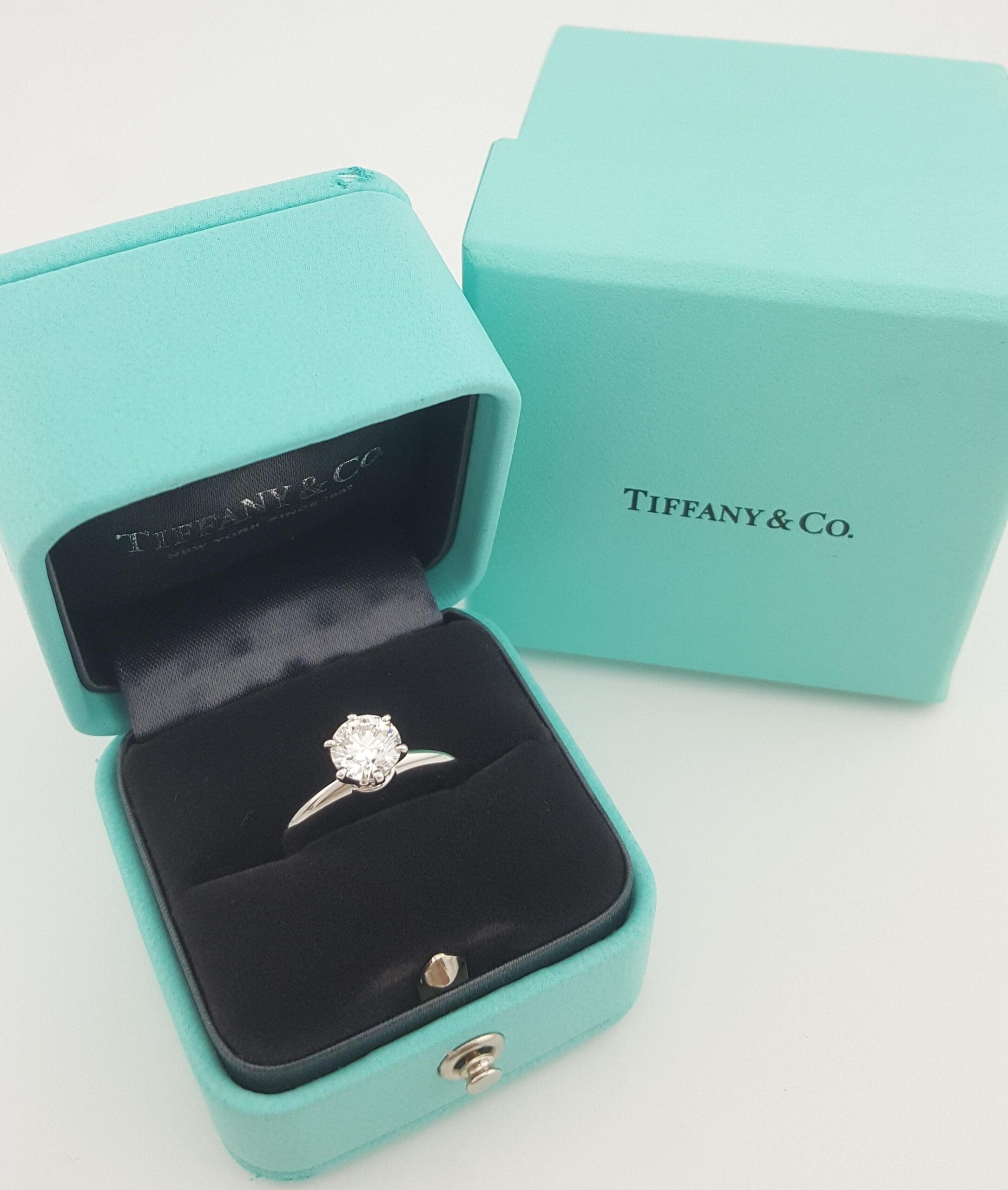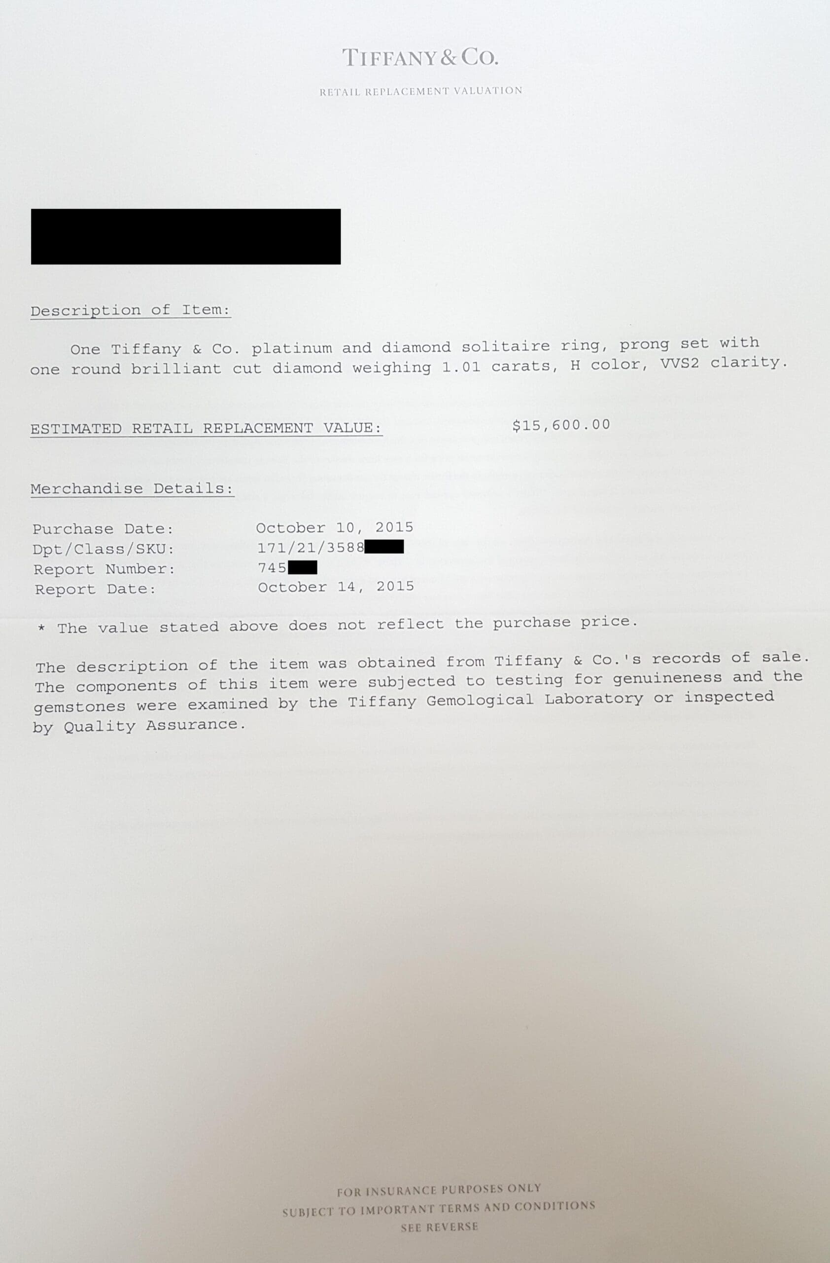 The ring is stamped "©TIFFANY & CO. PT 950 3588**** D1.01CT", comes with Tiffany & Co. Diamond Certificate, Valuation Report from October 2015 & T&Co ring box.