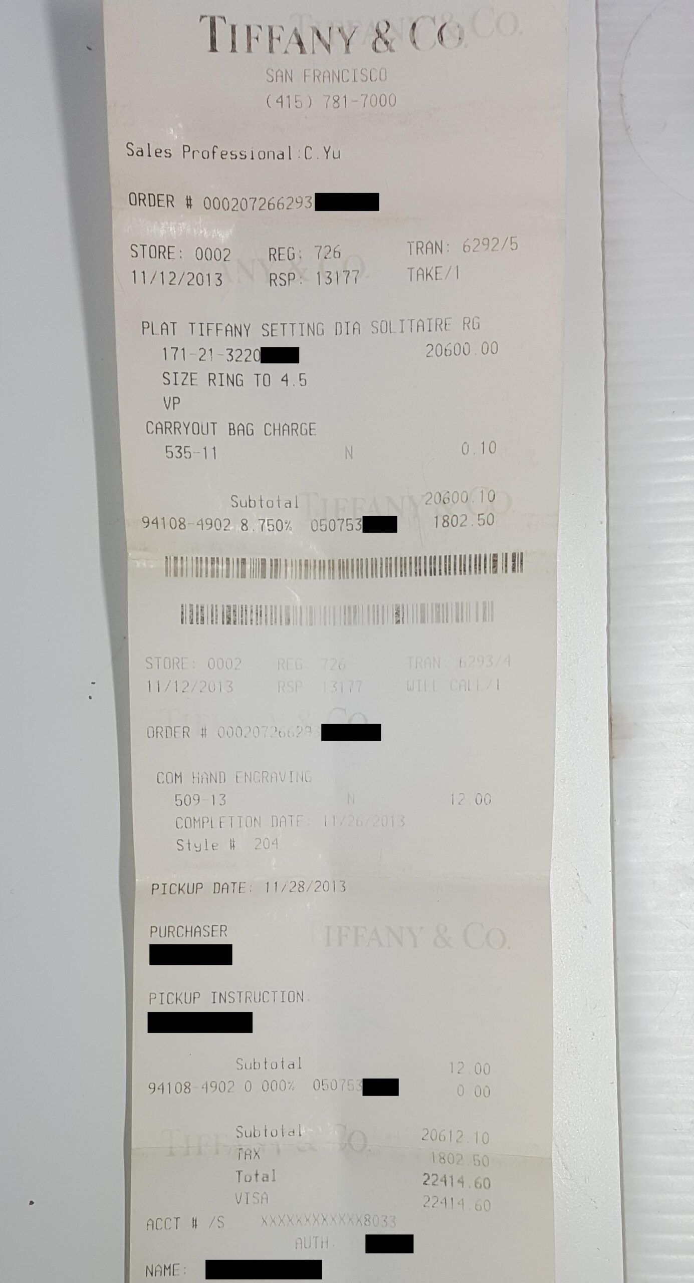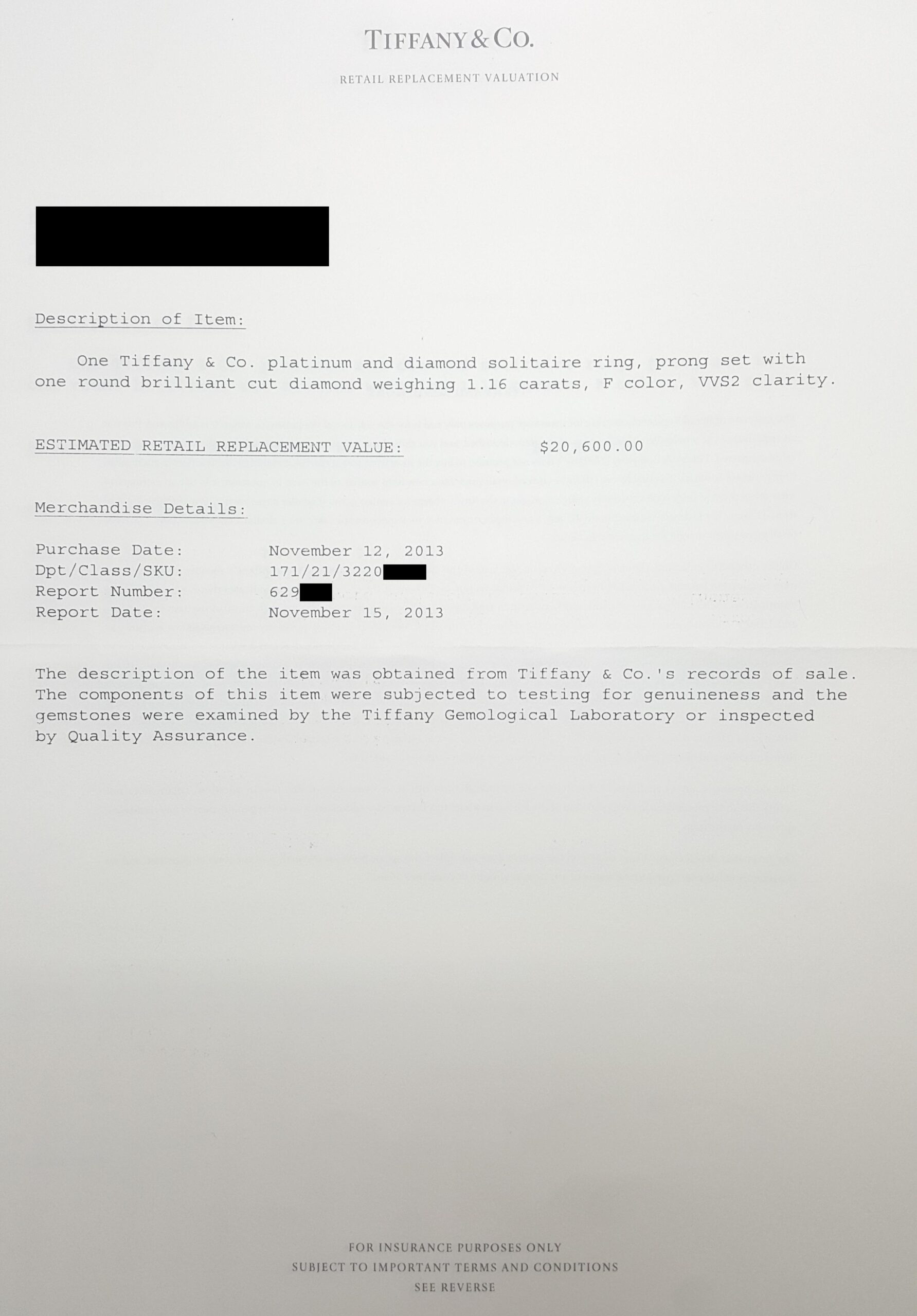 The ring comes with Tiffany & Co. Diamond Certificate, Valuation Report from November 2013 & T&Co ring box.