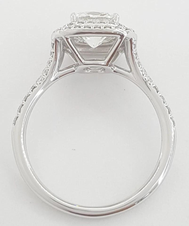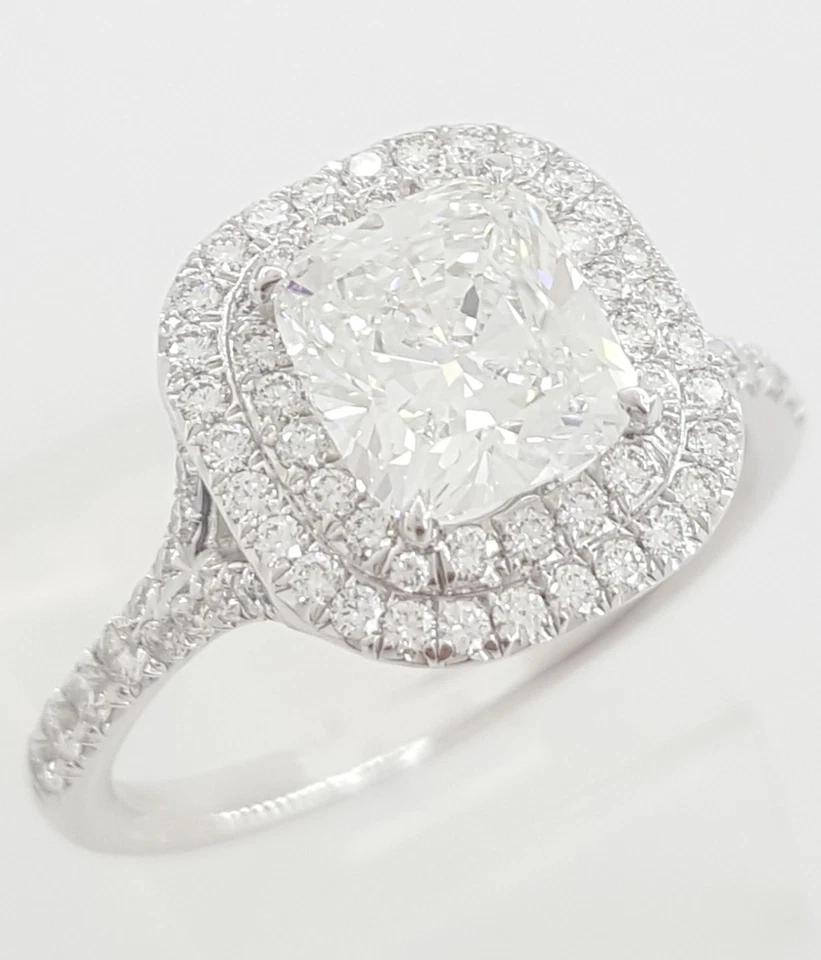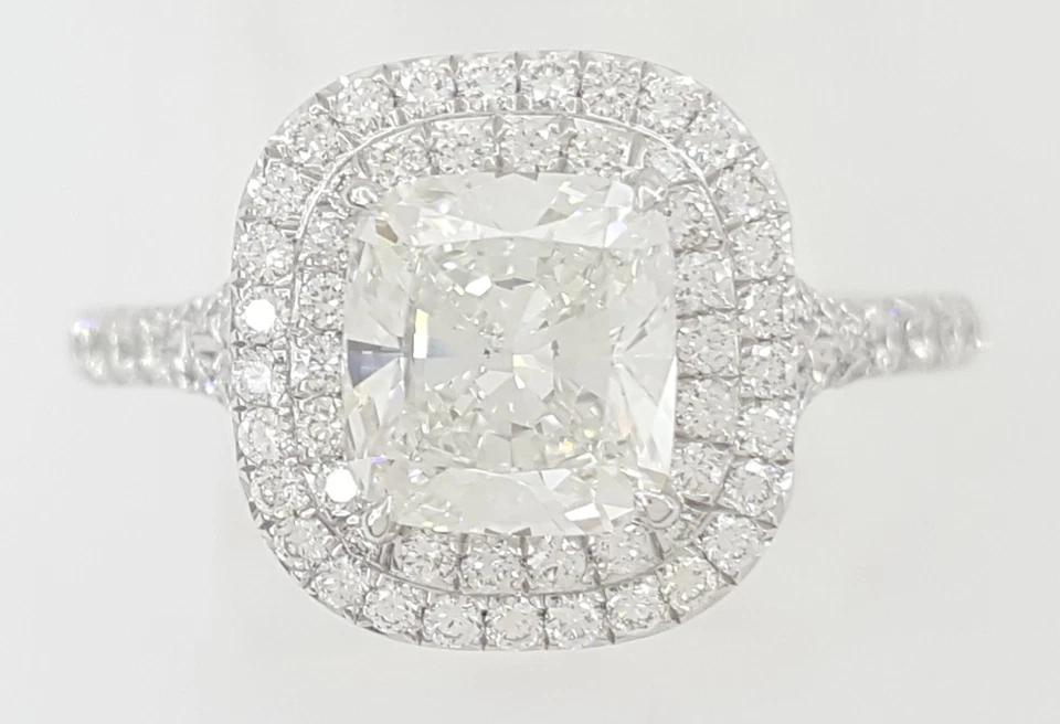 You are Buying an Authentic Tiffany & Co. Platinum Soleste® 1.99 ct Cushion Excellent Cut Diamond Double Halo Engagement Ring.