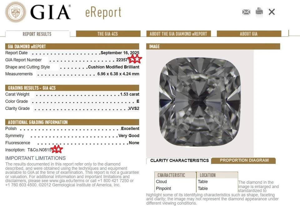 The ring weighs 5.5 grams, size 7, the center stone is a 1.53 ct Natural Cushion Brilliant Cut Diamond, E-F in color, VVS2 in clarity. GIA graded the center stone as E Color, VVS2 Clarity, Excellent Polish, Very Good Symmetry, None Fluorescence, with Crown inscription "T&Co.N0815****".