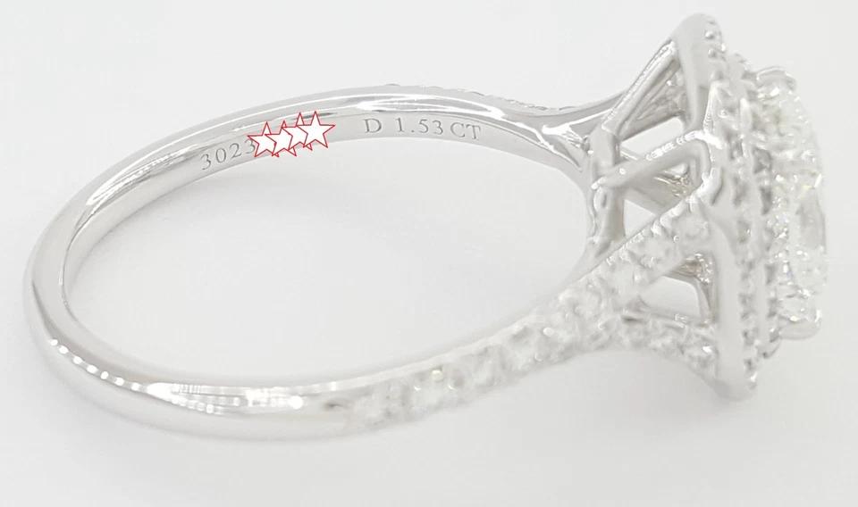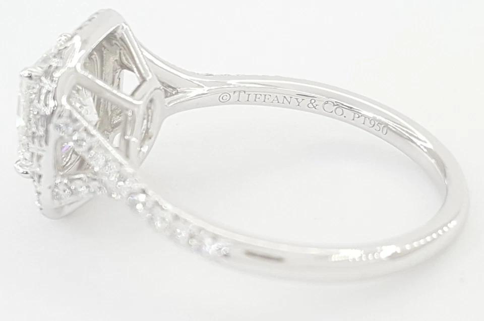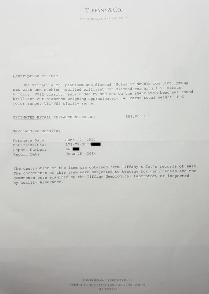 The ring is stamped "©TIFFANY & CO. PT950" & "3023**** D 1.53 CT".
