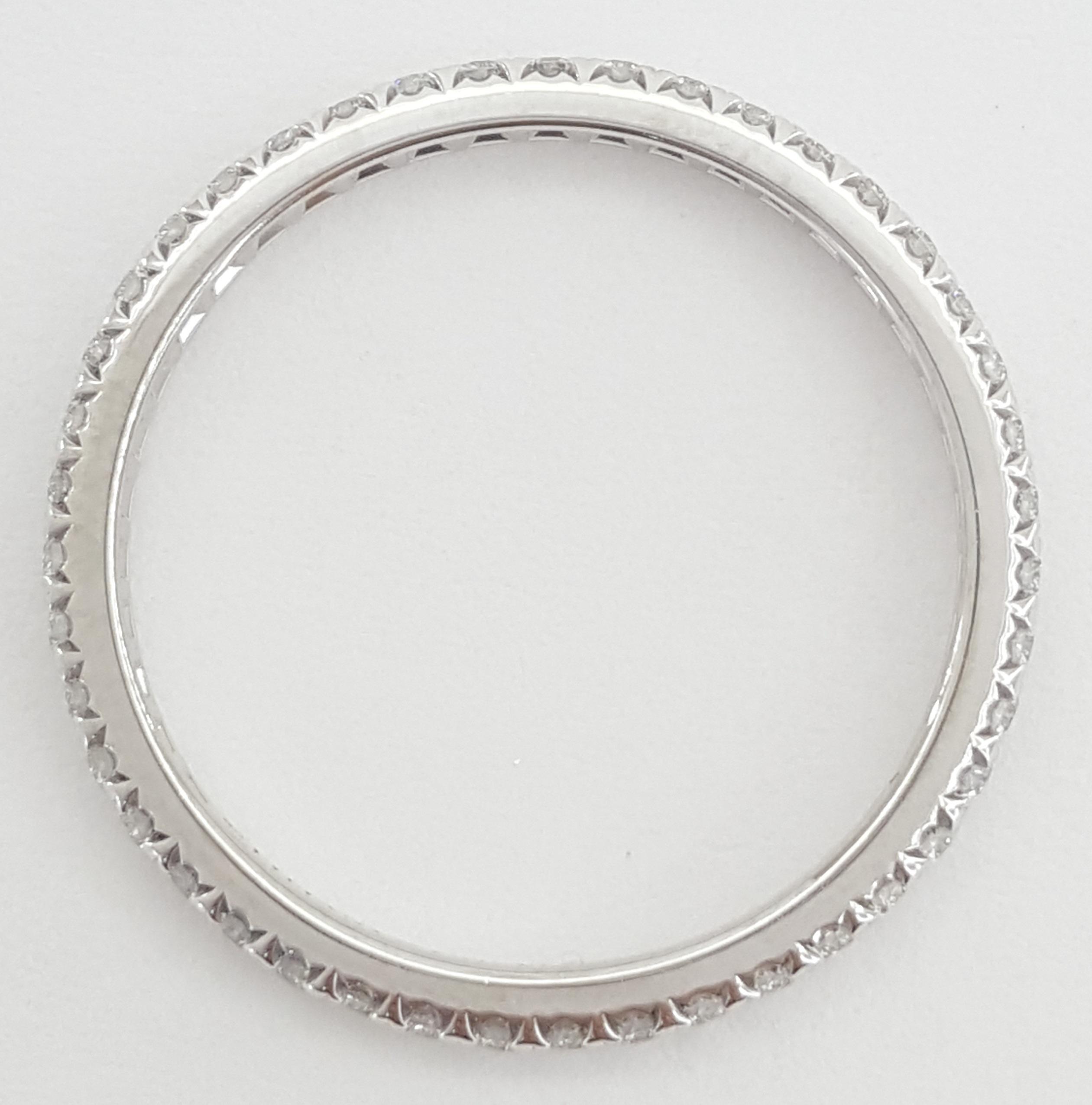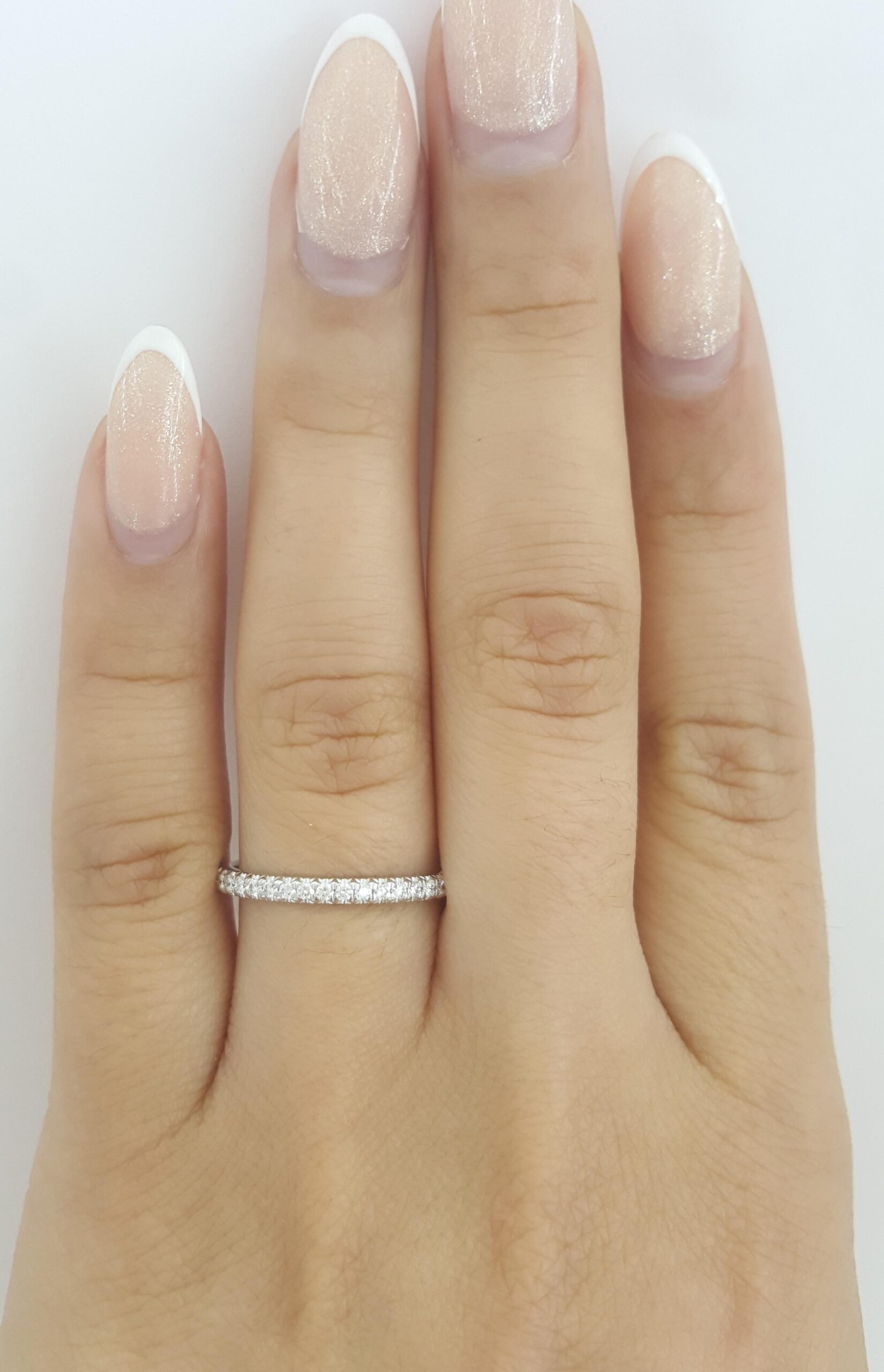 The ring weighs 2.5 grams, size 6.5, contains 43 Natural Round Brilliant Cut Diamonds weighing 0.34 ct, E-F in color, and VVS-VS in clarity, set in 4-prong settings.