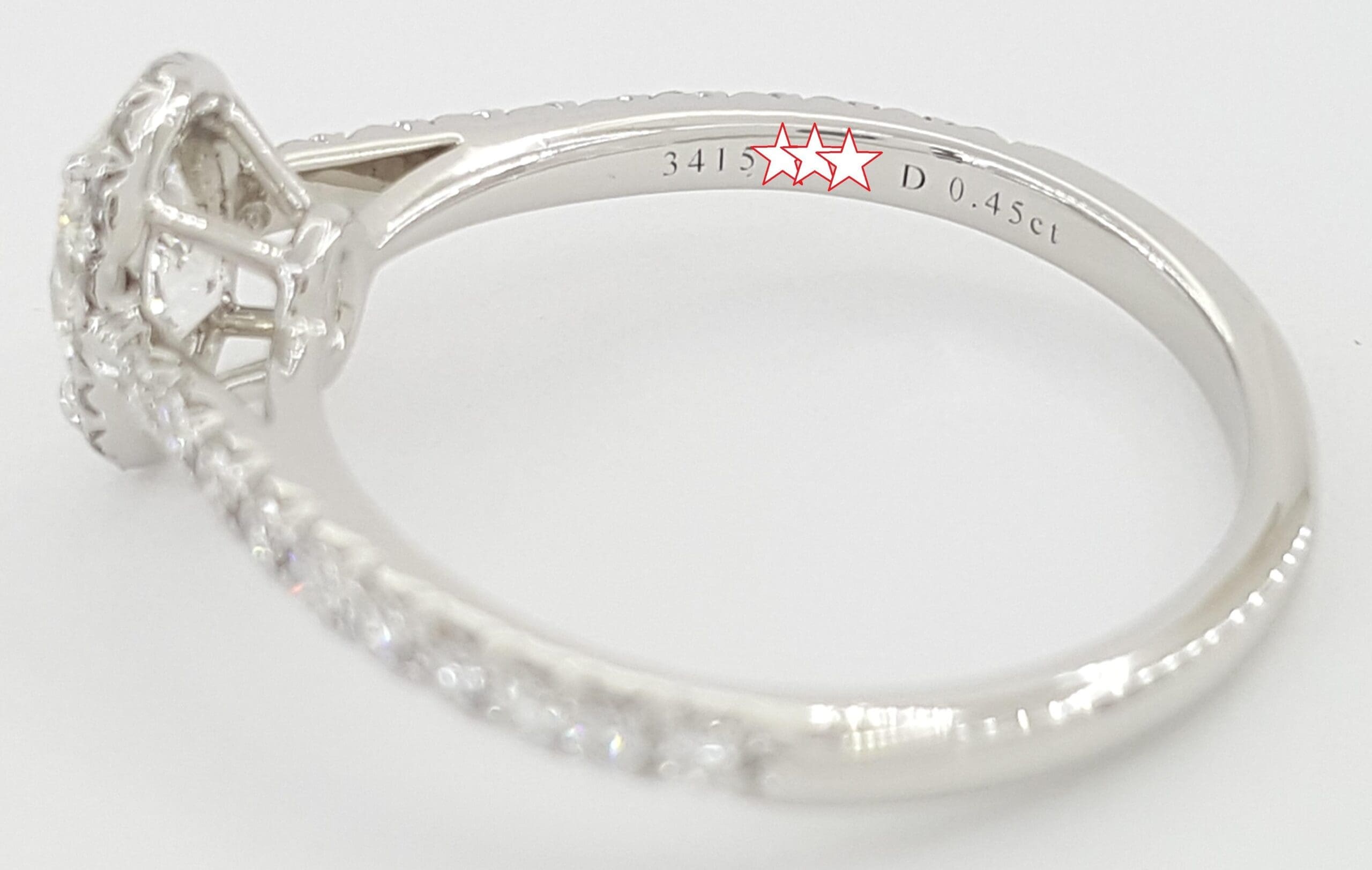 The ring is stamped "©TIFFANY & CO. PT950" and "3415**** D0.45 CT".