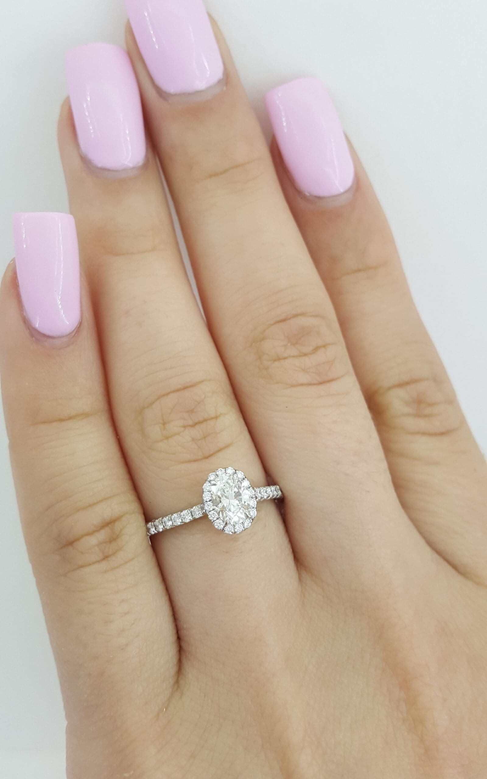 The ring weighs 2.6 grams, size 5, 7.5mm wide, the center is a 0.45 ct Natural Oval Brilliant Cut diamond, H in Color, VVS1 in Clarity, Ideal Cut.