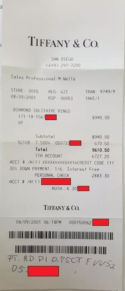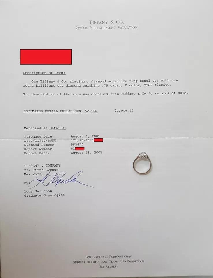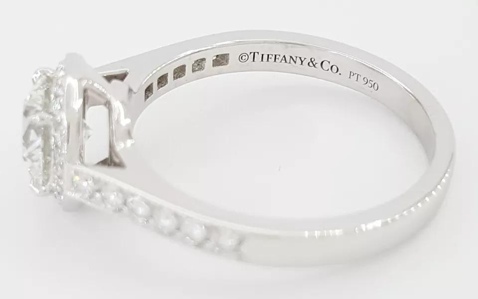 The ring is stamped "©TIFFANY & CO. PT950" and "1561**** D0.75 CT".