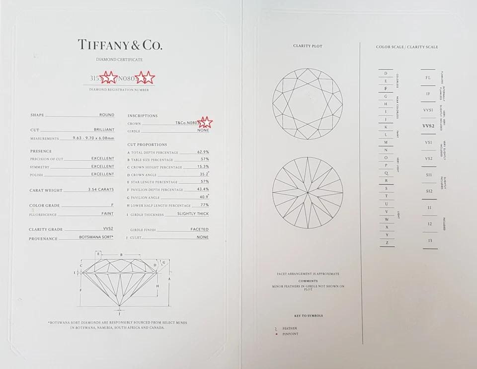The ring weighs 6.3 grams, size 5.75, the center stone is a Natural 3.54 ct Round Brilliant Cut Diamond, F in color, VVS2 in clarity, Excellent Cut, Excellent Polish, Excellent Symmetry, Faint Fluorescence, 9.63 - 9.70 x 6.08 mm, 62.9 % Depth, 57% Table. The center diamond crown is inscribed "T&Co.N0803****".