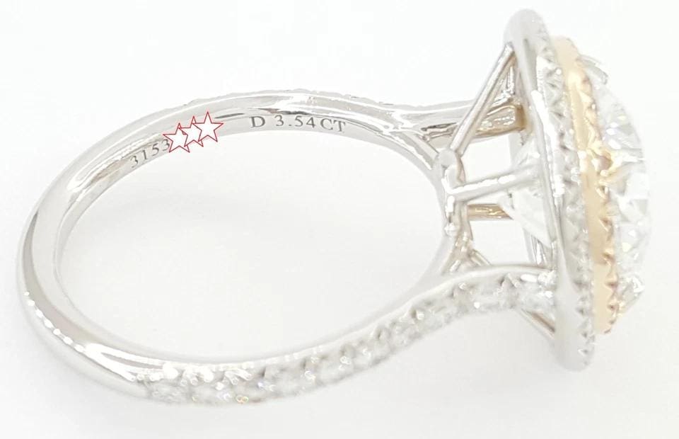 The ring is stamped "3153**** D 3.54 CT" and "©TIFFANY & CO. PT950 Au 750". Part of the Au750 stamp is covered due to Tiffany & Co. previously added sizing beads to the ring, our bench jeweler removed them.
