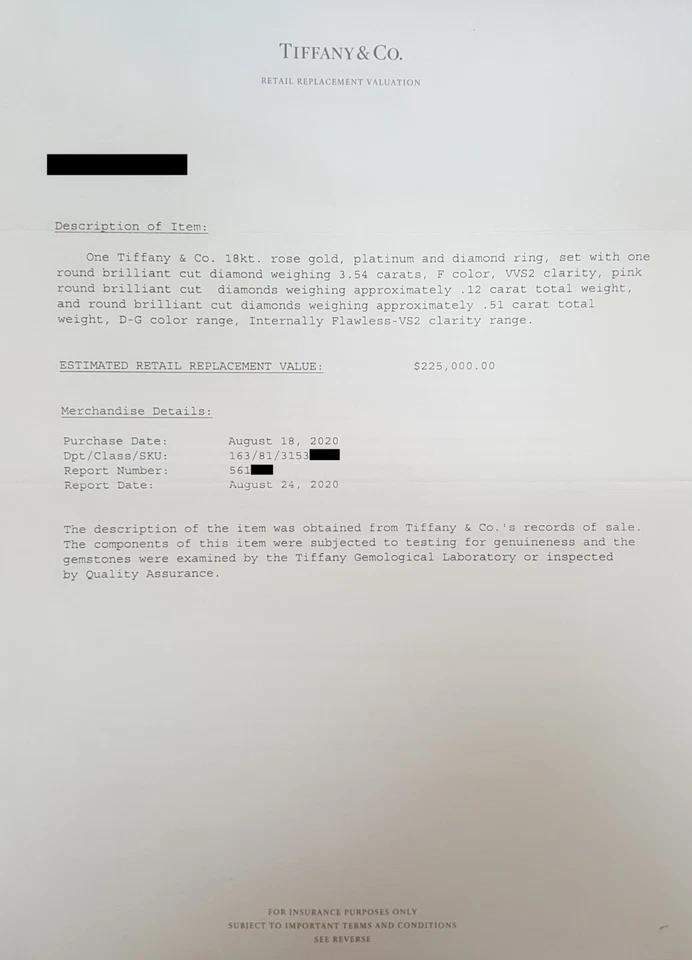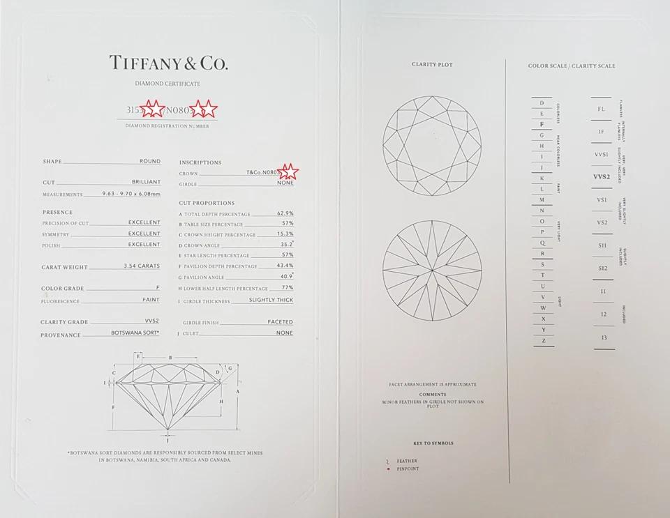 The ring weighs 6.3 grams, size 5.75, the center stone is a Natural 3.54 ct Round Brilliant Cut Diamond, F in color, VVS2 in clarity, Excellent Cut, Excellent Polish, Excellent Symmetry, Faint Fluorescence, 9.63 - 9.70 x 6.08 mm, 62.9 % Depth, 57% Table. The center diamond crown is inscribed "T&Co.N0803****".