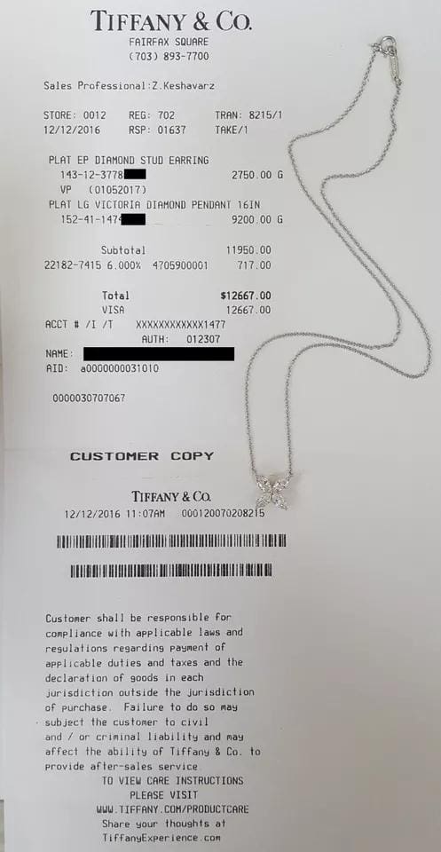 The pendant comes with T&Co. box and copy of the original Tiffany purchase receipt; it was sold in December 2016 for $9,200+tax, with a current retail price of $15,900 + Tax.