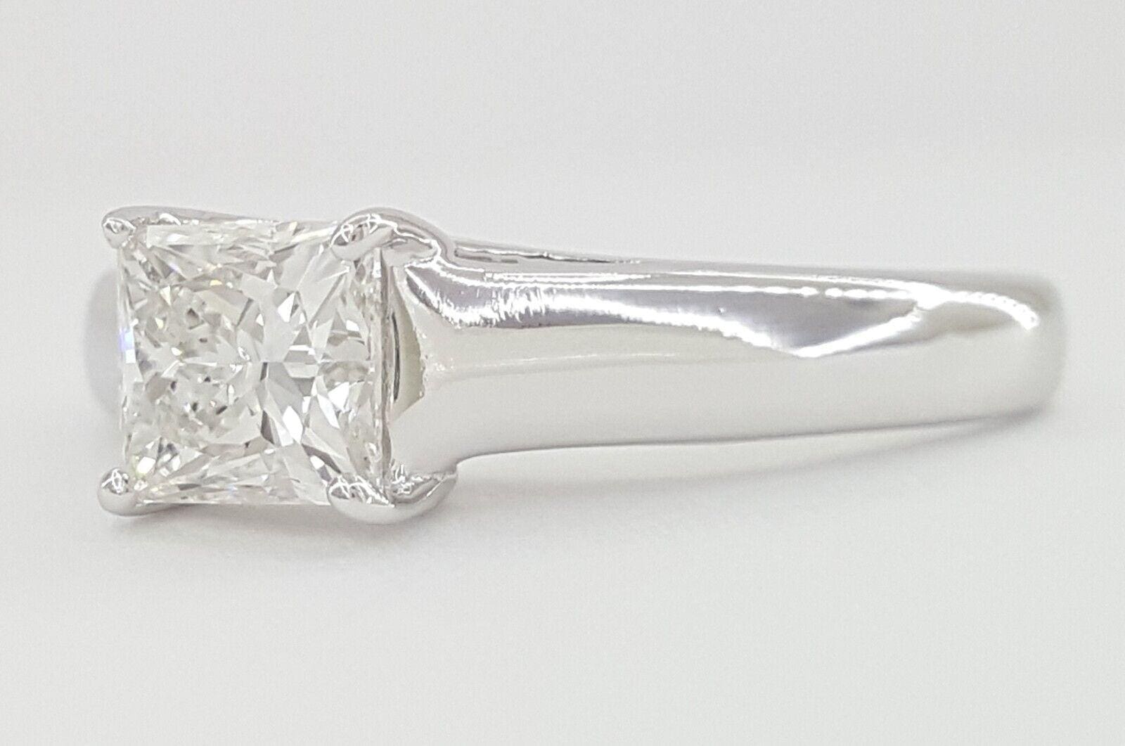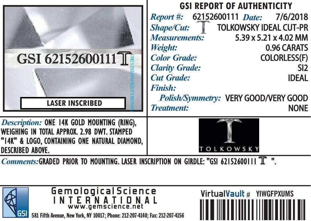 The ring weighs 3.8 grams, size 7.5, the center stone is a 0.96 ct Natural Princess Cut diamond, F in color, SI2 in clarity, Ideal Cut, Very Good Polish, Very Good Symmetry, Graded & Inscribed by GSI "GSI 6215260**** T" on the girdle. In like-New Condition.