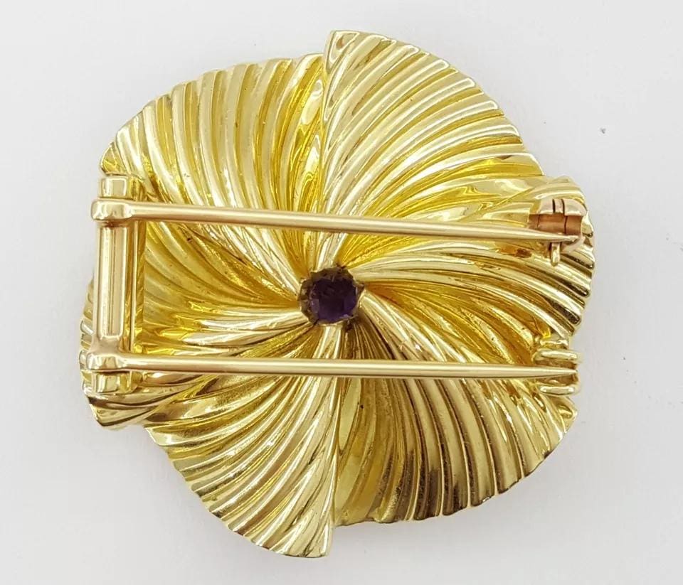 The brooch weighs 11.3 grams, 33.3-34.8 mm wide, contains 1 Natural 7mm Round Amethyst weighing approximately 1.2 ct.