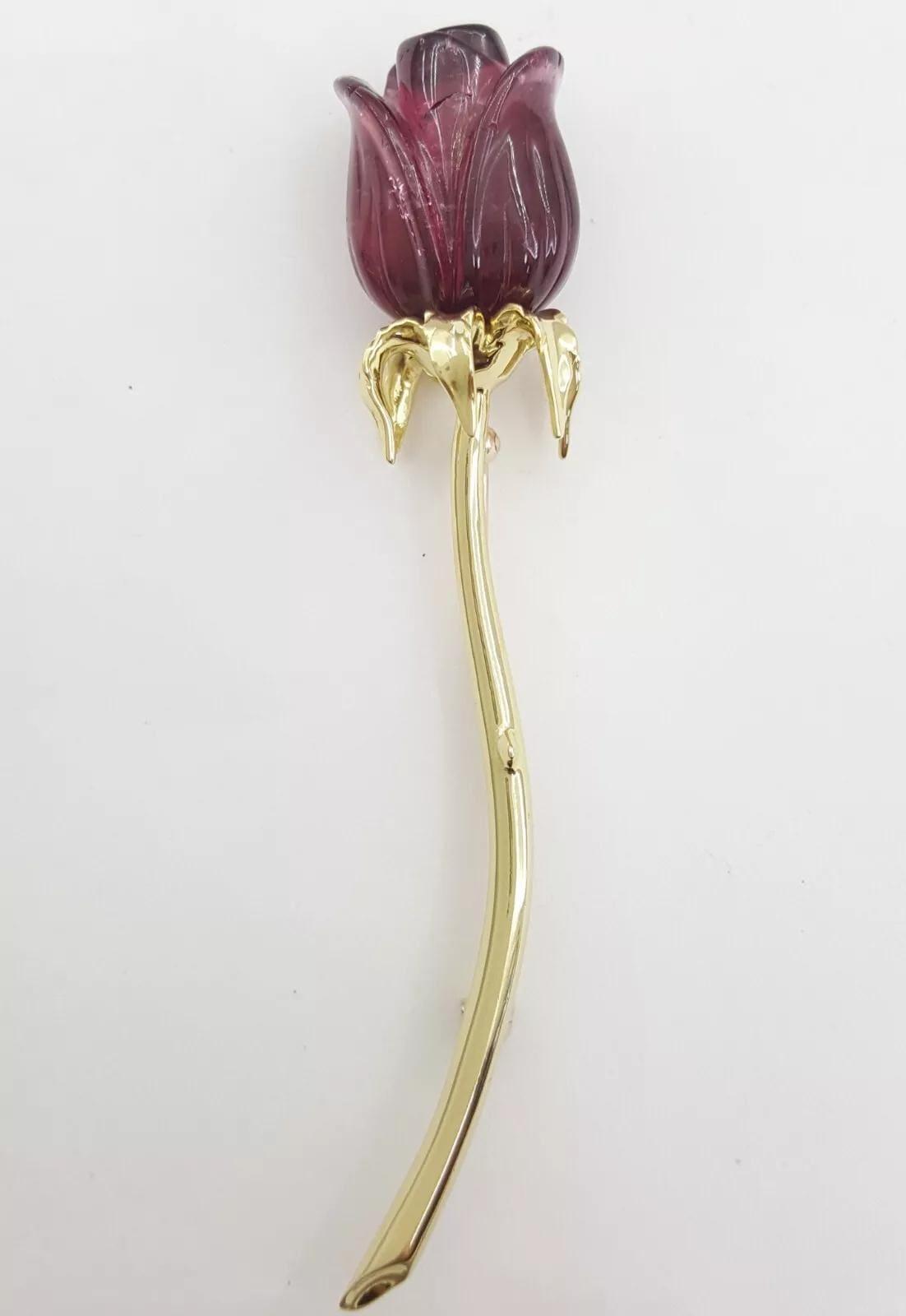 The brooch weighs 14.3 grams, 78.5 mm tall (3"), 14.8 mm wide, contains 1 Natural Carved Rose Amethyst