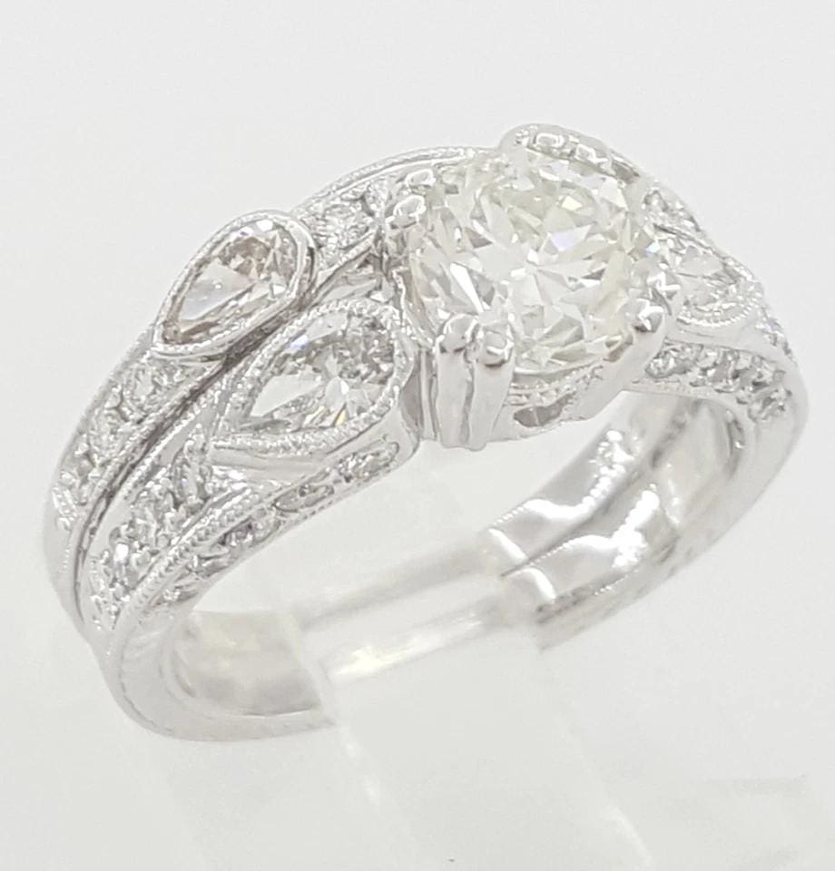 There are 4 Pear & 48 Natural Round Cut side diamonds weighing approximately 1.32 ct, F-H in color, VS-SI in clarity.