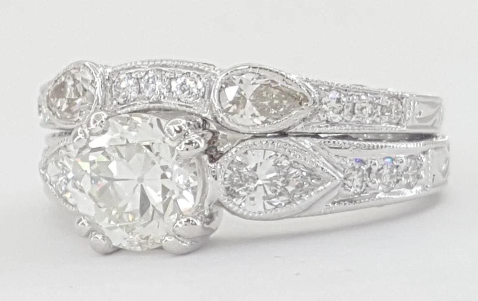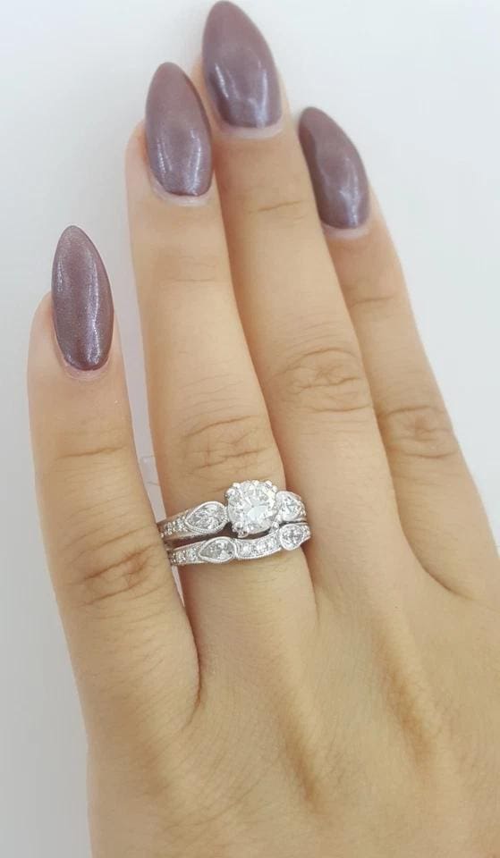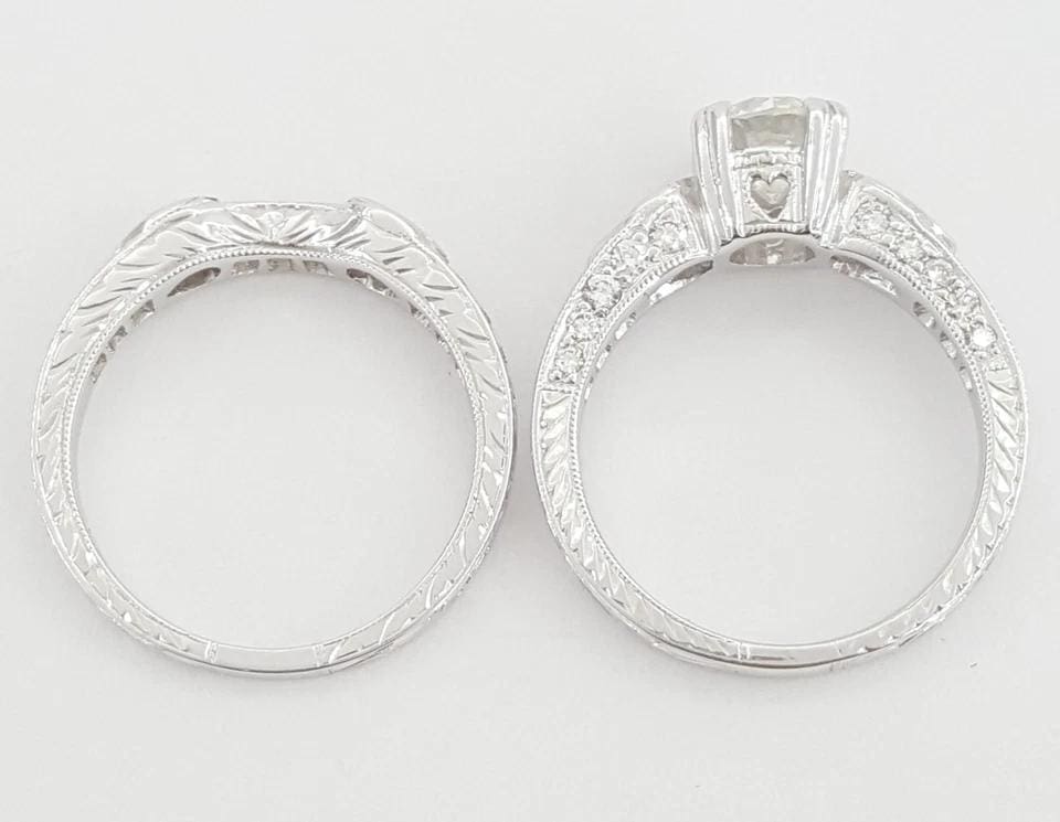 The rings weigh 6.2 grams total, size 6, with a 1.02 ct Natural Round Brilliant Cut center diamond, H-I in color, SI2-SI3 in clarity.