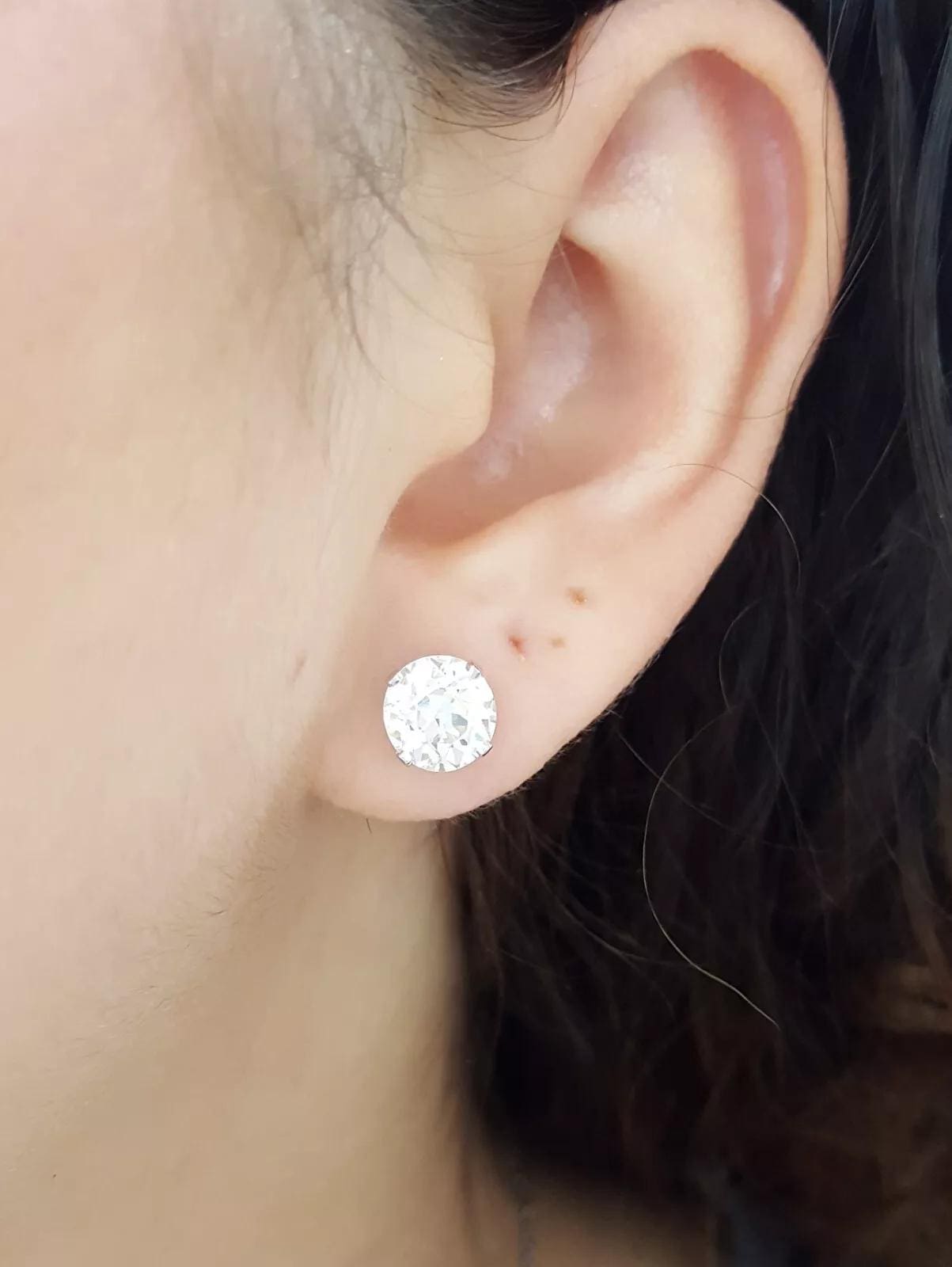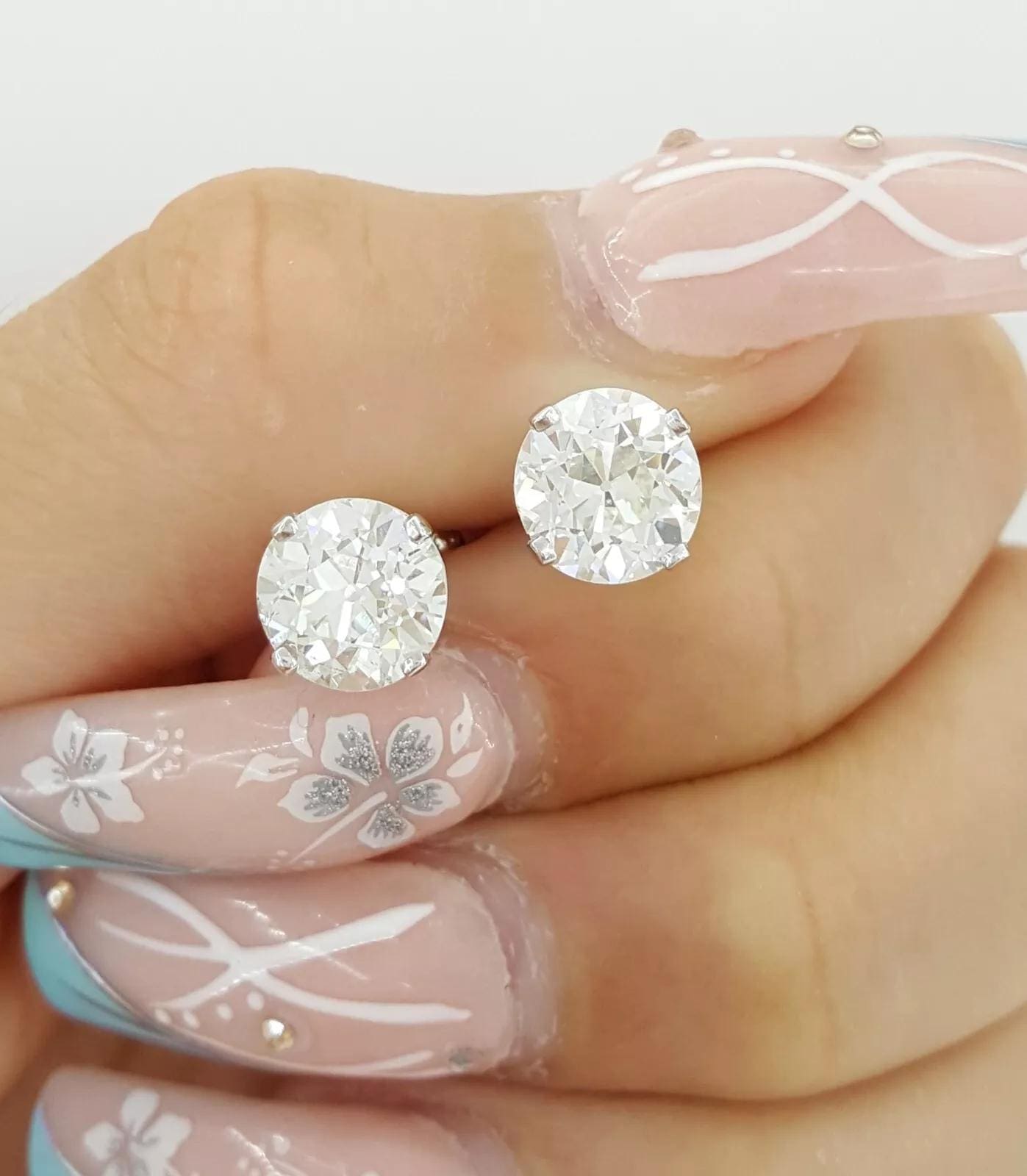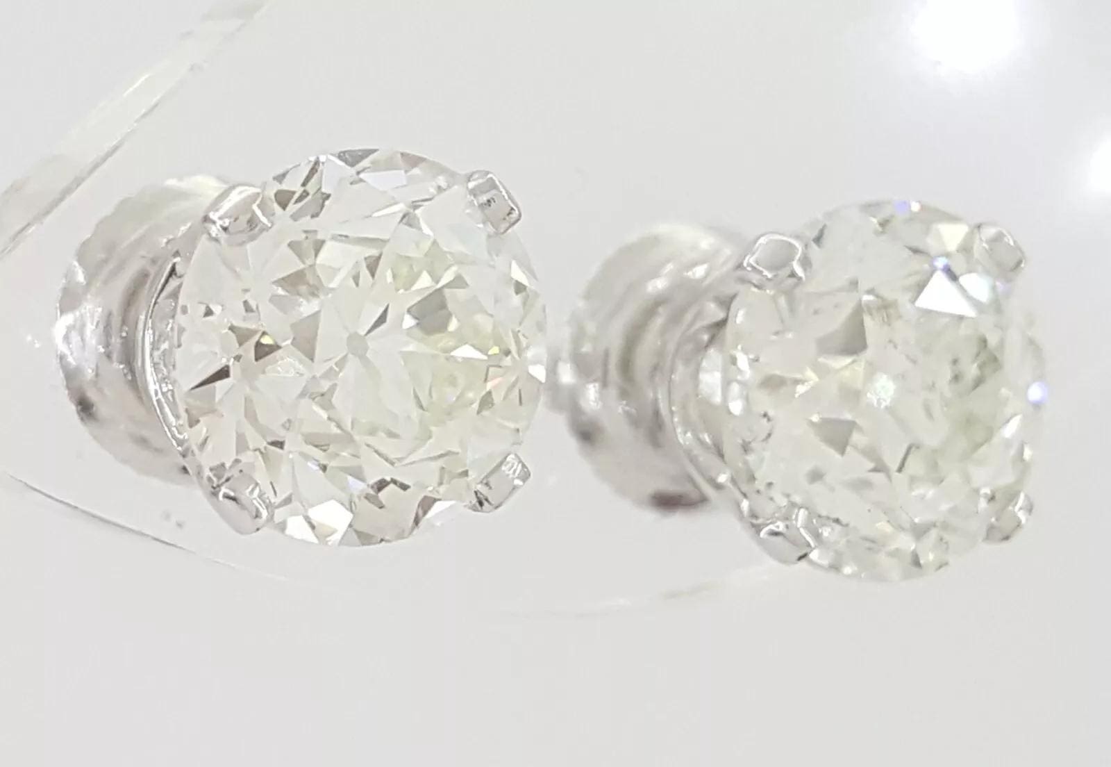 The earrings weigh 2.2 grams, contains 2 Natural Old European Cut diamonds weighing 3.88 ctw, J in color, VS2-SI2 in clarity. The diamonds faces up white & are 100% eye-clean.